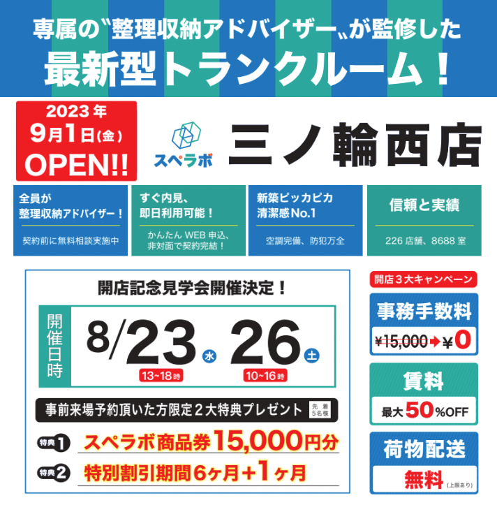 当社の大人気トランクルーム【スペラボ】は、新築で清潔感があり、専属の整理収納アドバイザー監修店舗。大変利用しやすいとご評価頂いております!241店舗9173室を運営中!!