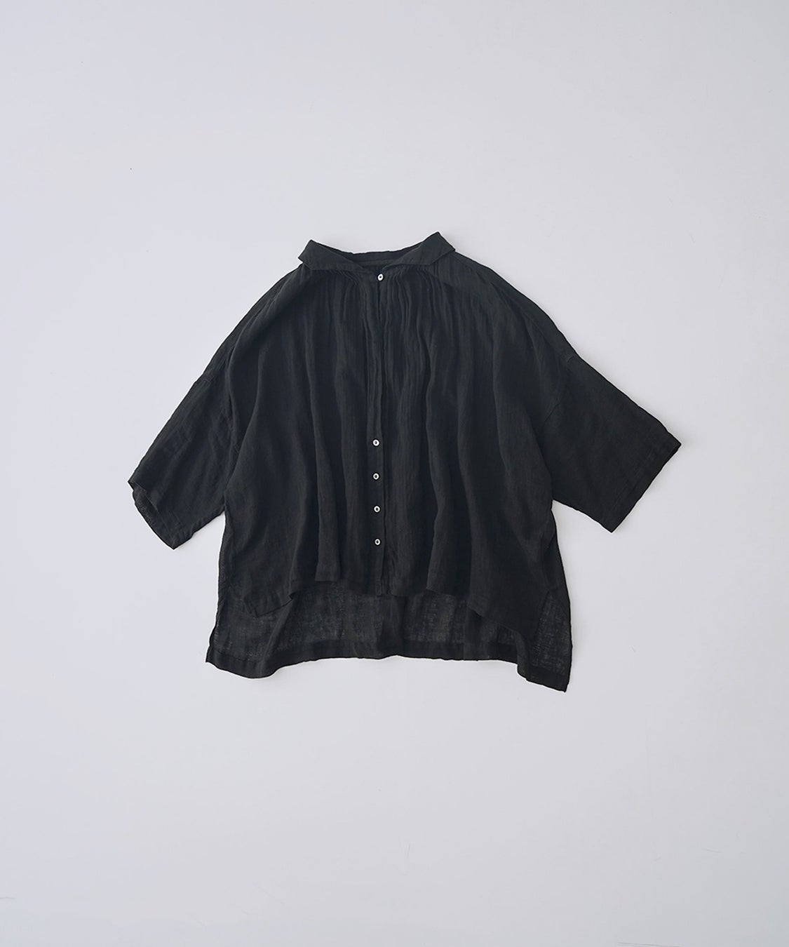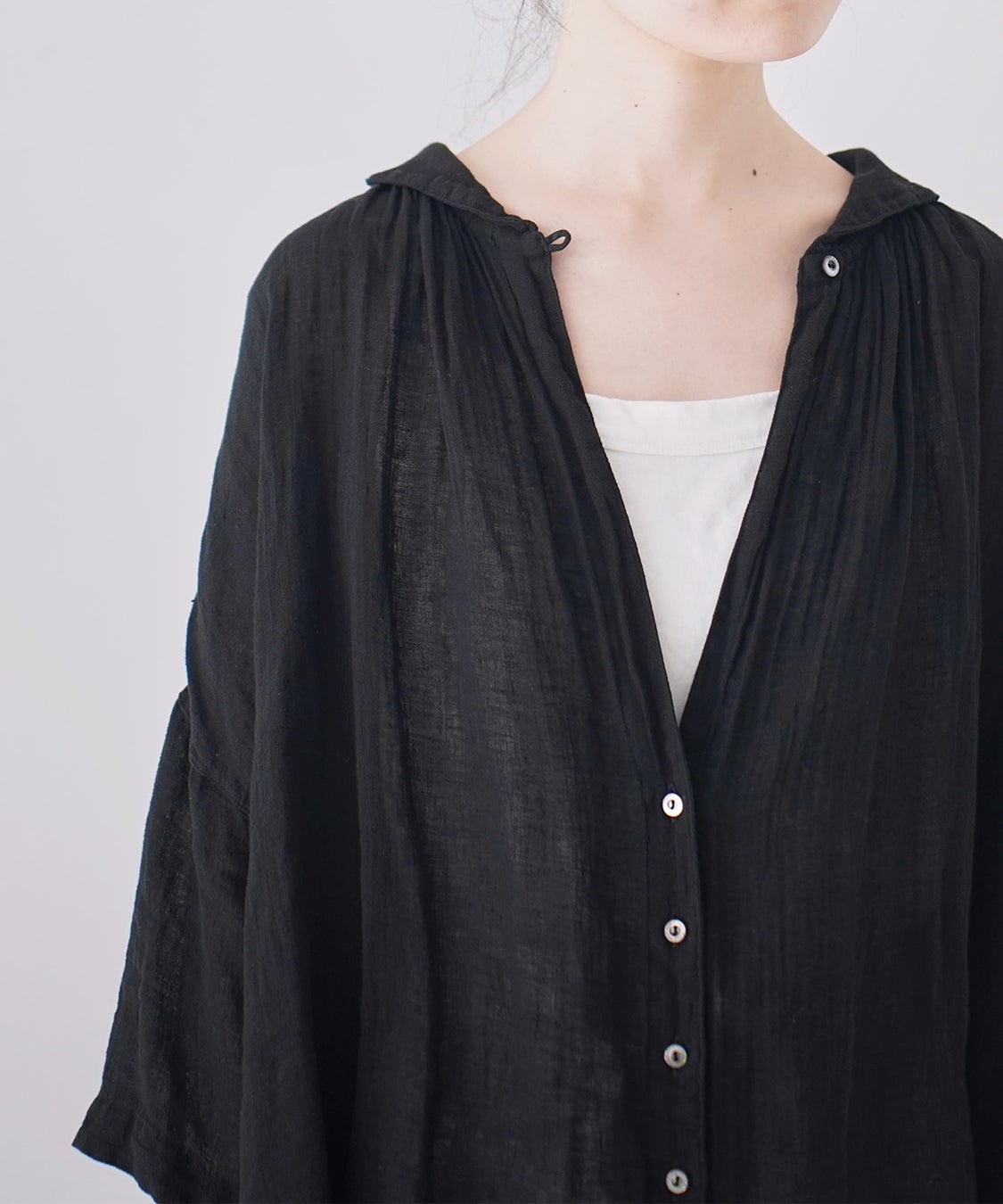 襟元で清涼感と柔らかい印象を併せ持つミニセーラーカラー、ゆとりのあるボクシーなシルエットで風通しが良く、涼しい着用感がポイントのシャツです。トップスシャツとしてはもちろんのこと、ワンピースの上にカーディガン感覚で羽織る事も可能。