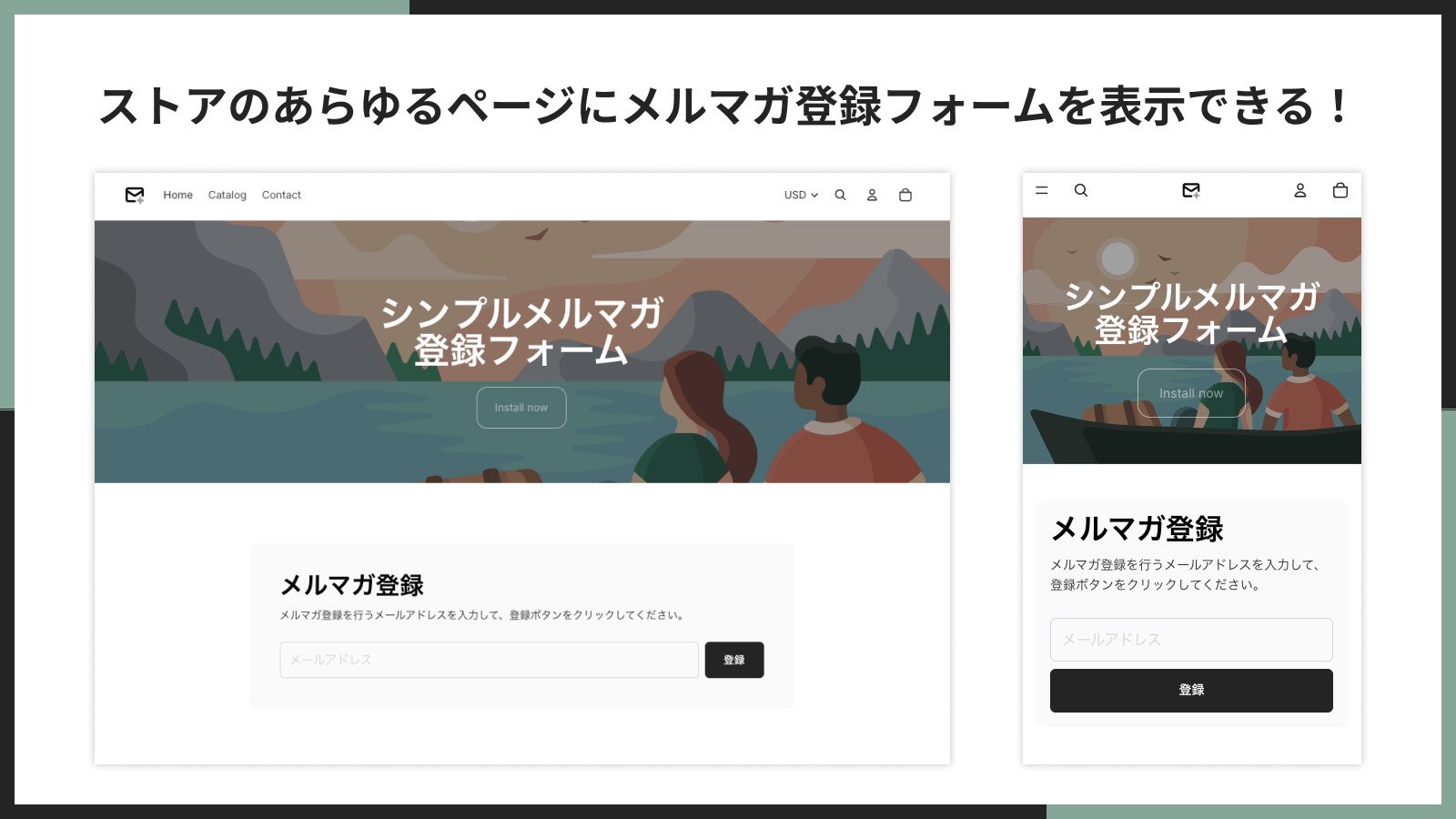「シンプルメルマガ登録フォーム|メールマガジン購読設定」は、ホームやコレクション、商品ページなど 任意のページにデザイン性の高いメルマガ登録フォームを追加できるアプリです。