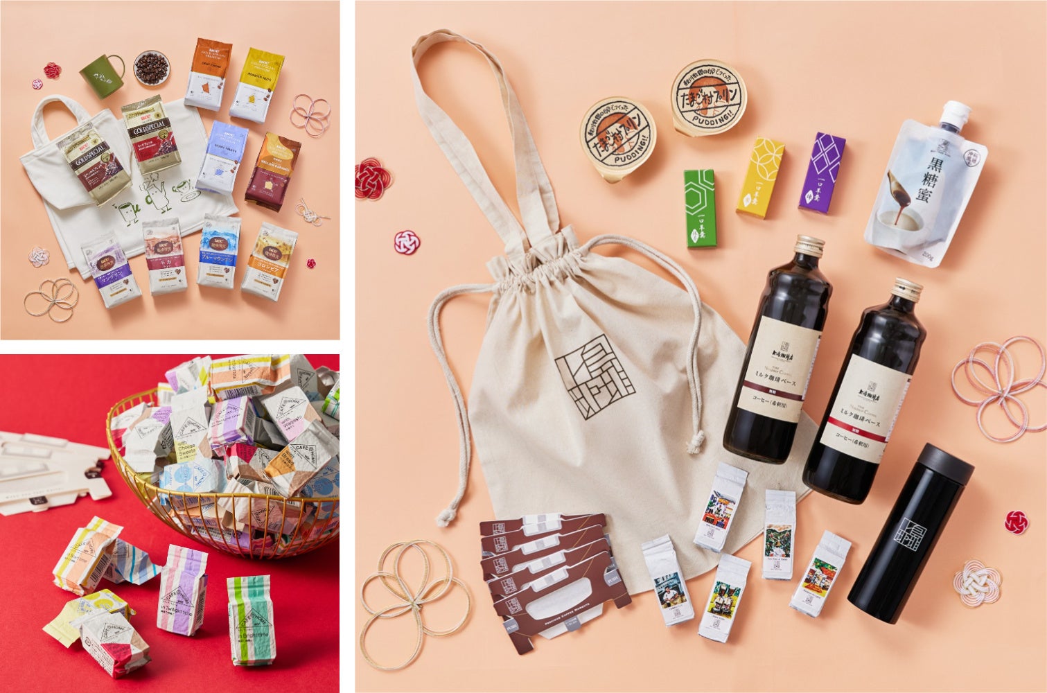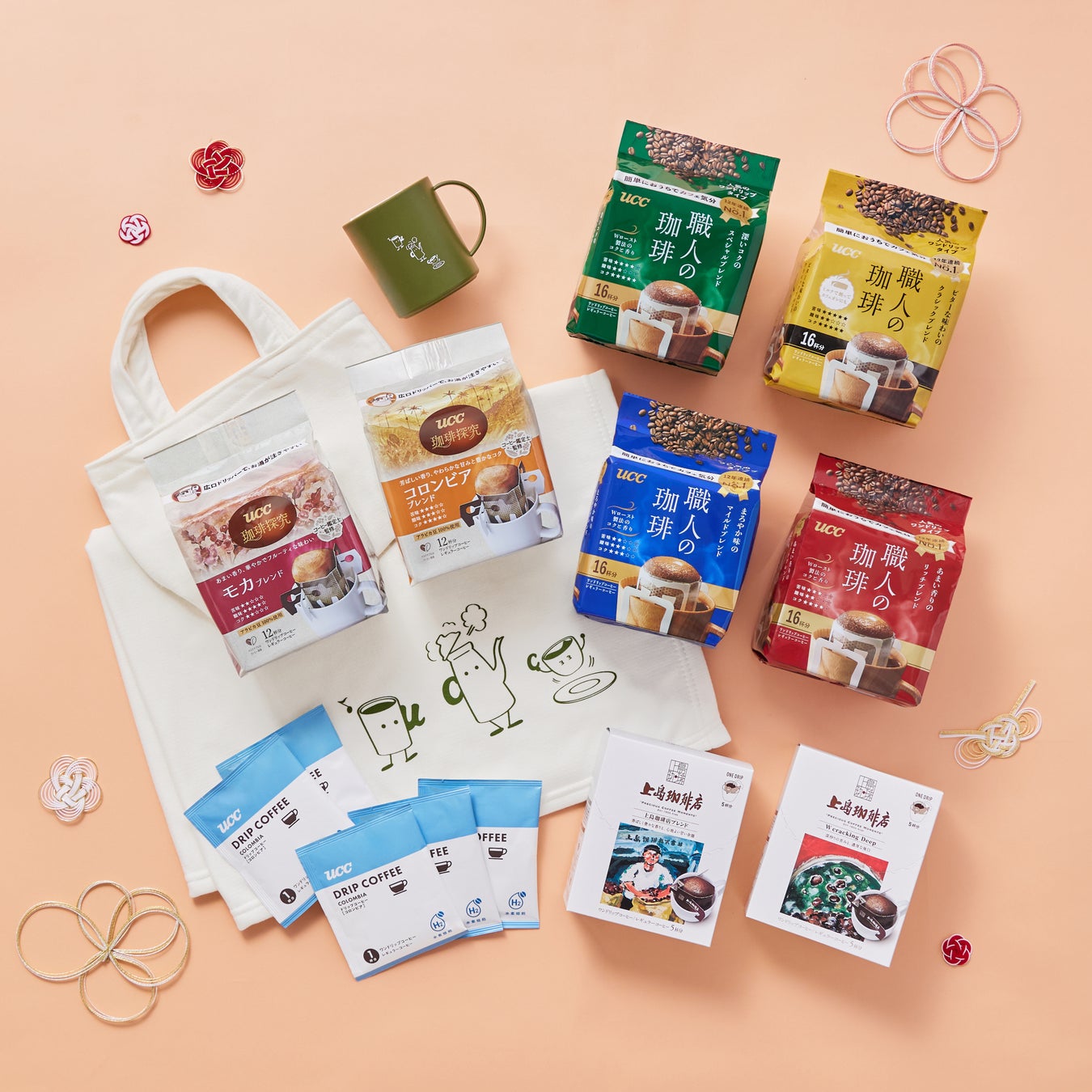 UCCグループの様々なアイテムを取り扱うUCC公式オンラインストアでは、今年に入り、お客さまにさらに多様なコーヒーの楽しみ方を知っていただきたいと考え、COFFEE STYLE UCC株式会社が販売するUCC独自技術「フレッシュキューブ」※1でコーヒーを1杯分ずつ真空パックしたワンドリップコーヒー『CAFE@HOME(カフェアットホーム)』や、主力カフェ業態『上島珈琲店』 の店頭販売アイテムを新たにラインアップに加えました。今回は、そのラインアップより、お客さまの飲用スタイルや好みに応じて選んでいただけるよう、UCC飲用スタイル別詰め合わせセット3種(豆・粉・ワンドリップ)・フレッシュキューブセット2種・上島珈琲店のコーヒー詰め合わせ、の全6種を数量限定で販売します。福袋の中には、限定アイテムとして、カップやマグなどをモチーフにした可愛らしいUCCオリジナルキャラクター入りのブランケットやマグを含むセットや、店舗ロゴ入りのシックなボトルと巾着になる便利なトートバッグ付きセットをご用意しています。