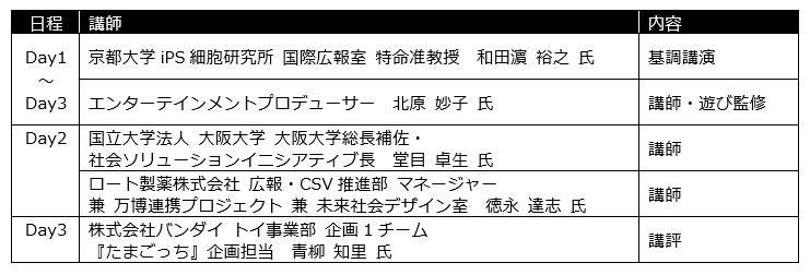 受講生は、1日目にiPS細胞研究所の和田濵 裕之氏の「“iPS細胞”を知る」と題した基調講演や、iPS細胞研究所内の見学などiPS細胞についての知識を深めた後、エンターテインメントプロデューサーの北原 妙子氏から遊びの本質や原則、ゲームの成り立ちについての講演を聞き、グループワークを交えながら、ゲームを創るための視点を学びました。2日目は、大阪大学SSIの堂目 卓生氏から「幾何学的な精神」に加えて経験や感性に基づく「繊細の精神」の必要性、そして、ロート製薬株式会社の徳永 達志氏からは、伝える相手に憑依して考えることの大切さなどを学びました。最終日は、完成したゲームをチームごとにプレゼンテーションし、株式会社バンダイの青柳 知里氏をはじめ、3日間サポートいただいた先生方からも講評をいただきました。最後に、制作したゲームをこどもも大人も一緒に楽しみ、充実した3日間が終了となりました。