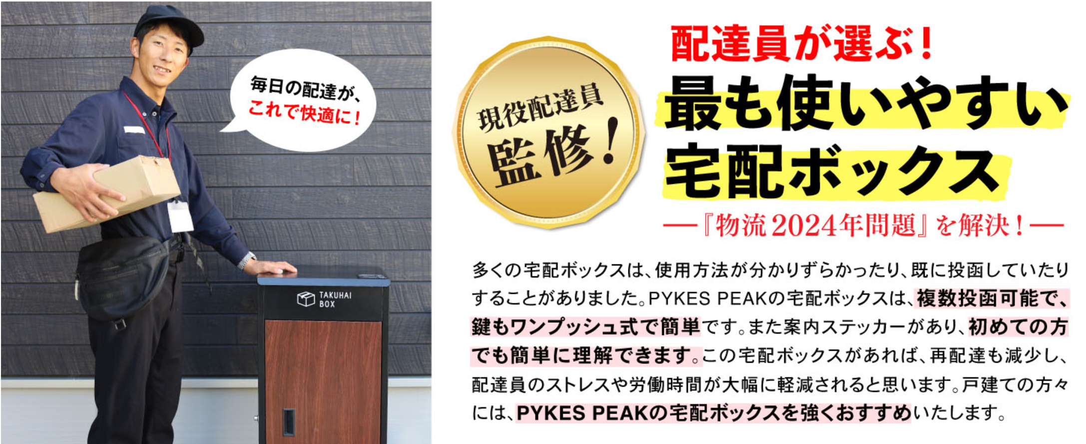 この現状を踏まえ、PYKES PEAKは「みんなで配達員さんを助けよう」プロジェクトを実施いたします。宅配ボックスの普及を通じて1万時間の労働時間を削減し、配達員さんの過酷な労働環境への対応、物流の「2024年問題」解決を目指します。