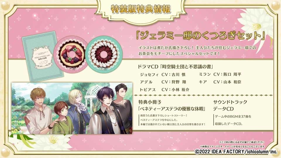 サウンドトラックデータCDでは、ゲーム中のBGM全37曲を収録しております。そして、特典小冊子「ベネティーアステラの優雅な休暇」では、雨宮うた氏書き下ろしショートストーリーを収録。ベネティーアステラを中心にした、本編では描かれていない騎士団と主人公の日常を描いています!