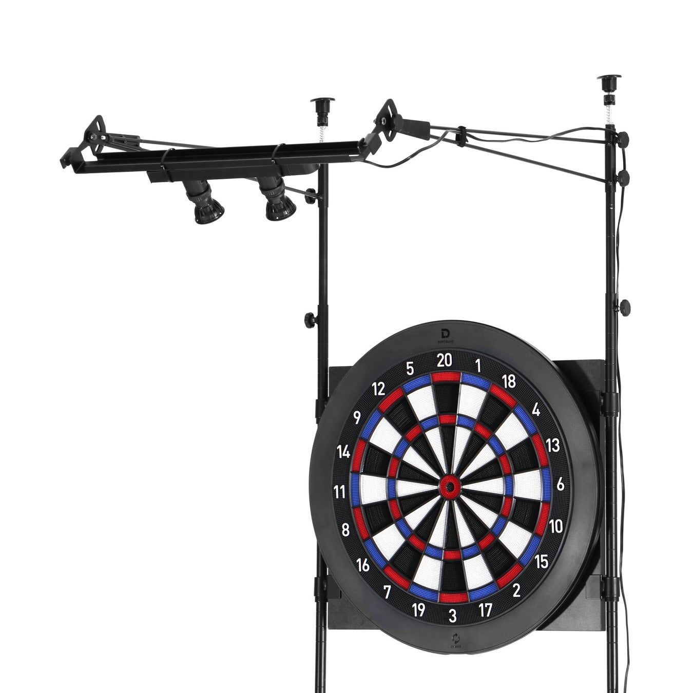 市販のダクトレール(推奨サイズ:全長30~50cm以内)を取り付けて、照明を設置できる独自のシステムを採用。高さ・角度(最大90度まで)調整機能を備え、適切なライティングを整えられます。セグメントに影が落ちることなくダーツボードを明るく照らすことができ、夜間の自宅練習も鮮明に狙いを定めることが可能です。間接照明的な効果で、自室をダーツバーのようなムードに演出するにも最適です。
