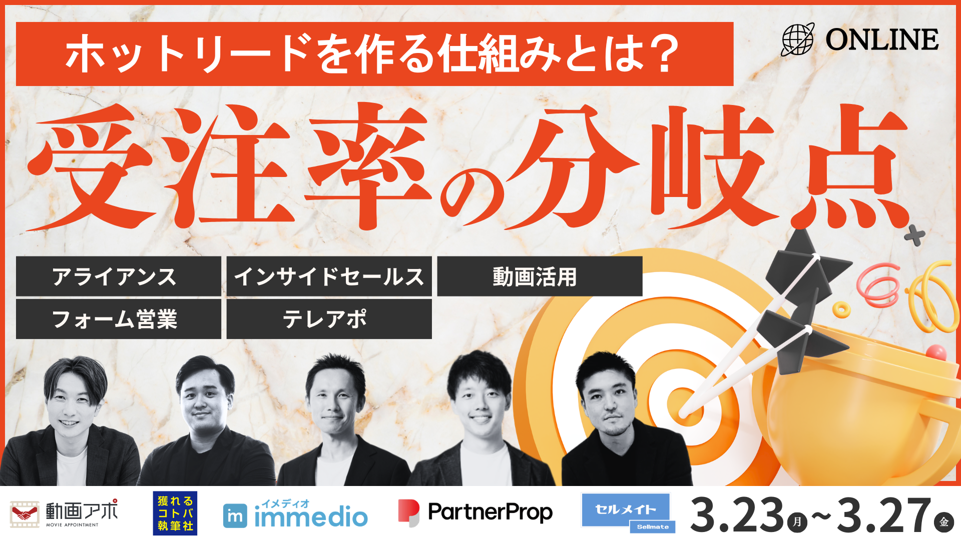 本ウェビナーでは、ホットリードの創出から受注率の向上までを一気通貫で攻略するための実践的な営業戦略をテーマに、商談獲得を「担当者の勘」から「再現性ある仕組み」へと変えるための5つの重要戦略を各社が解説します。
