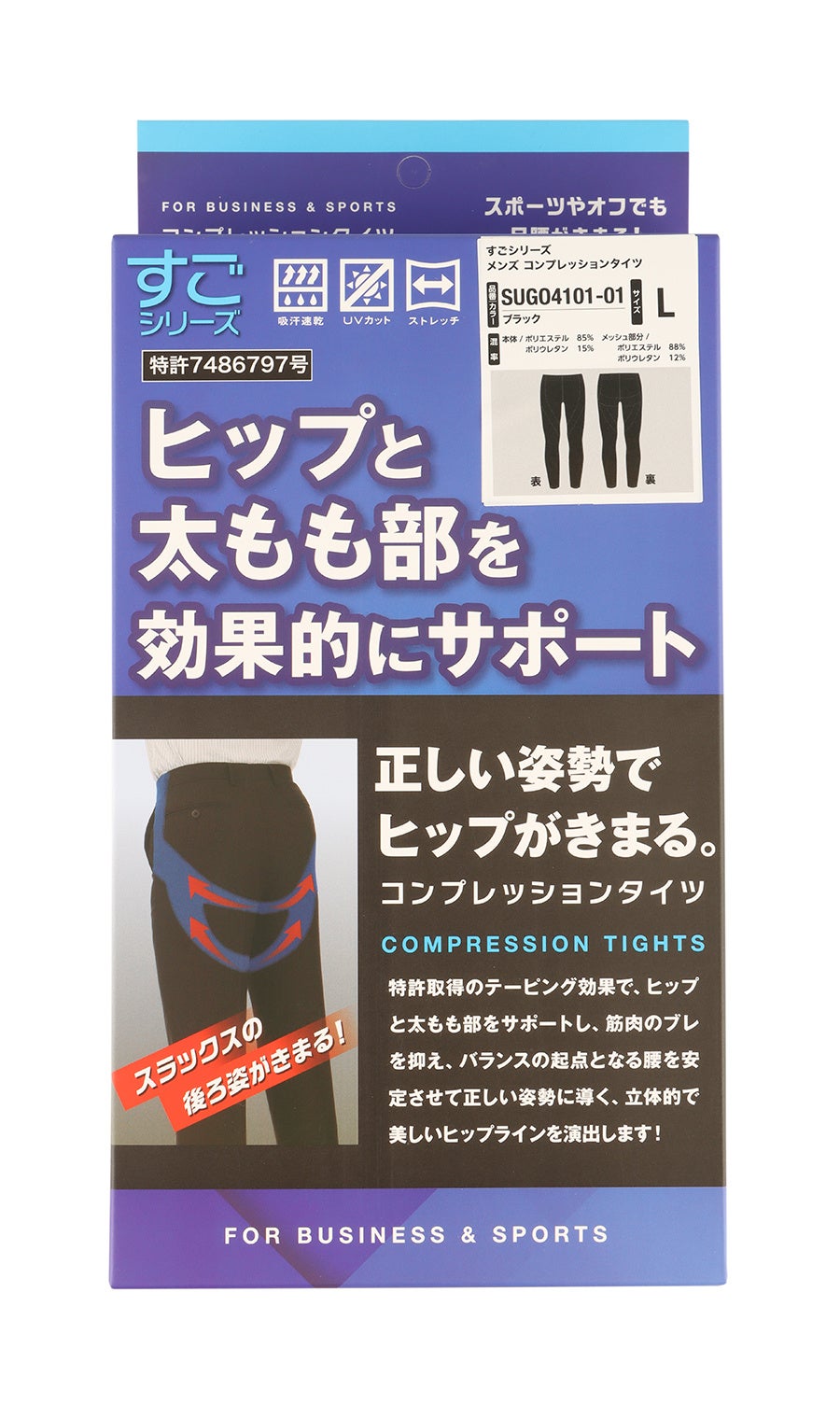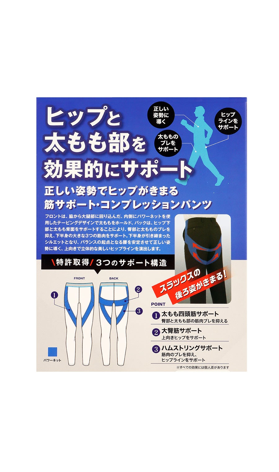 下半身の大きな3つの筋肉をパワーネットにより、特許取得のテーピングライン効果にて、筋肉を引き締め上に持ち上げる構造を再現しています。これにより、ヒップ周りも上がるためシルエットはきれいに見え、バランスの起点となる腰も安定します。「スーツ専用コンプレッションタイツ」は、大きな筋肉のブレを押さえ安定させることで立ち姿、歩き姿が美しく見える仕組みとなっています。ここ一番の大事な会議やプレゼンにおいて、テーピング効果でヒップと太ももが引き締まり、正しい姿勢に導くことで相手に好印象を与えることができます。