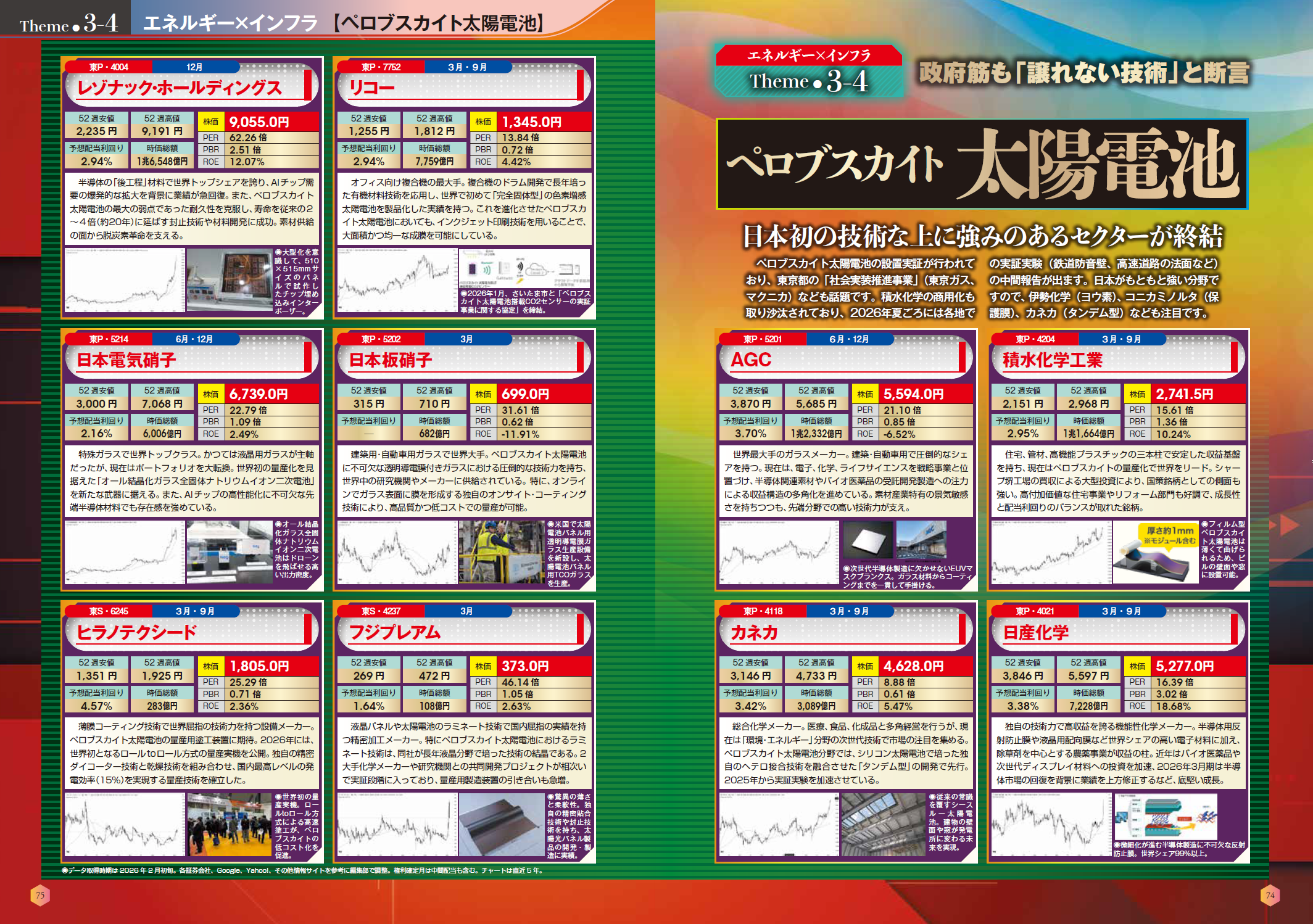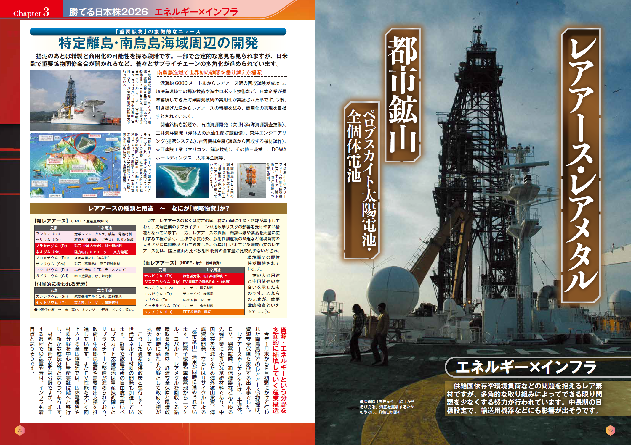 「第3章 エネルギー×インフラ」では、核融合発電、資源・エネルギー、防災・国土強靭化、レアアース・レアメタル、都市鉱山、ペロブスカイト太陽電池・全個体電池などを解説し、関連銘柄も網羅。直近ニュースになった南鳥島のレアアース採集関連も取り上げています。