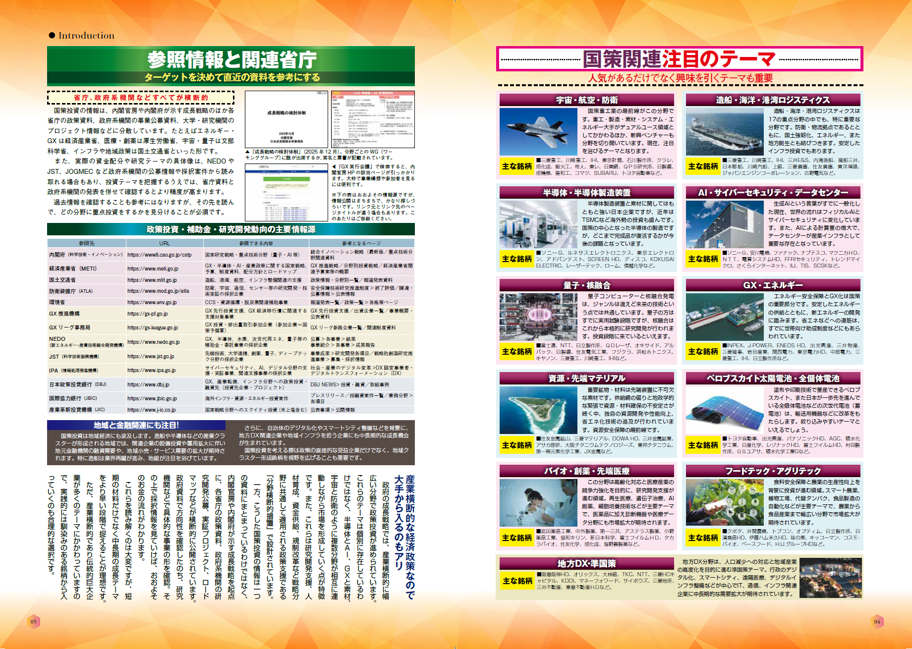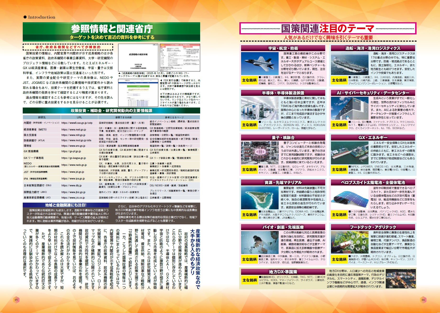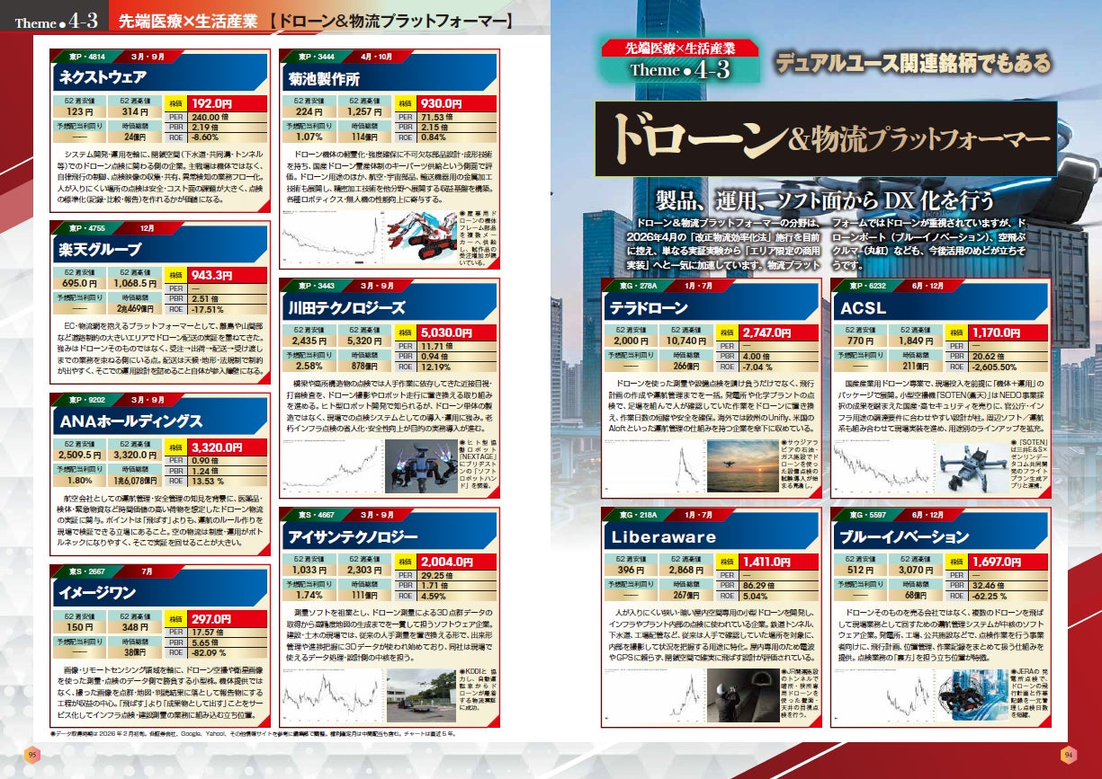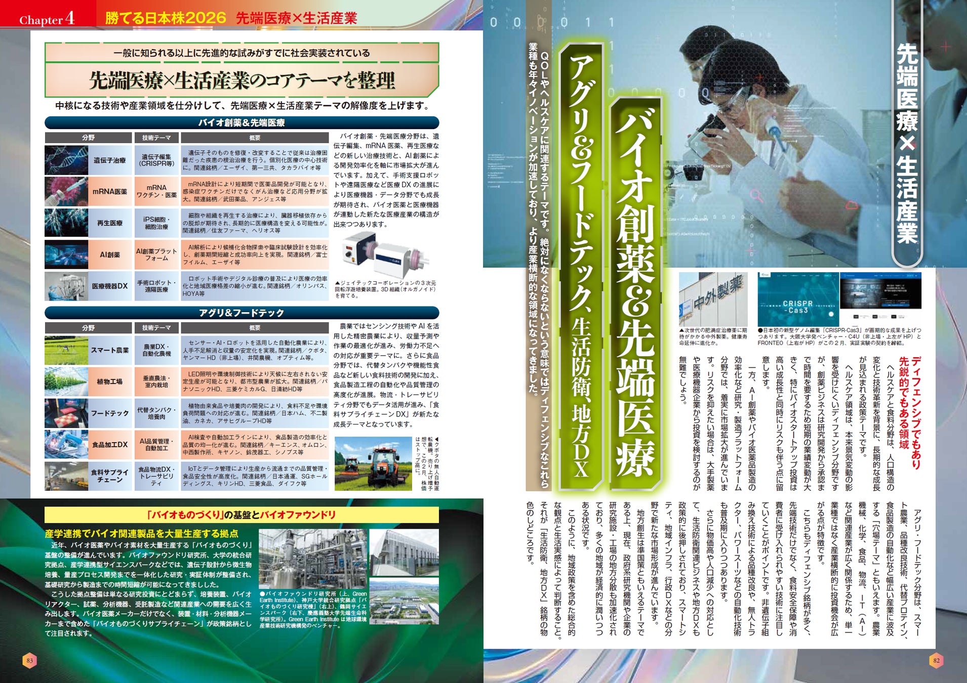 「第4章 先端医療×生活産業」では、バイオ創薬&先端医療、アグリ&フードテック、生活防衛、地方DX関連銘柄を取り上げました。ディフェンシブでありながら安定成長が期待される銘柄群です。スマートシティや先端技術の社会実装などもテーマとしており、横断的な銘柄の特性がわかります