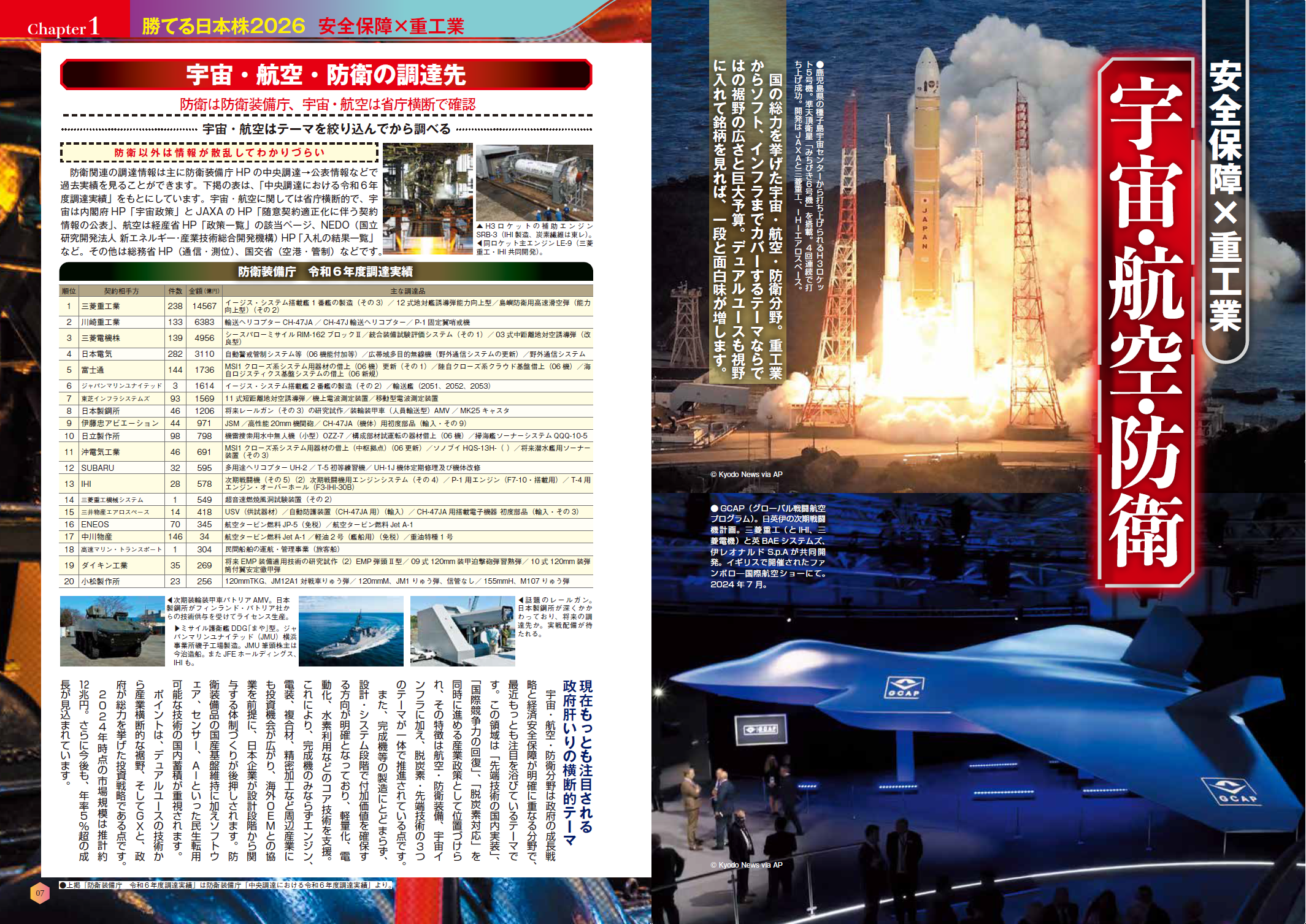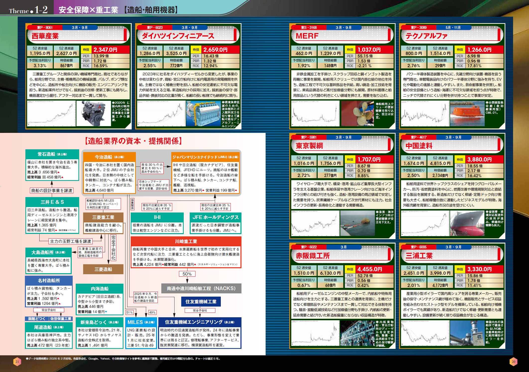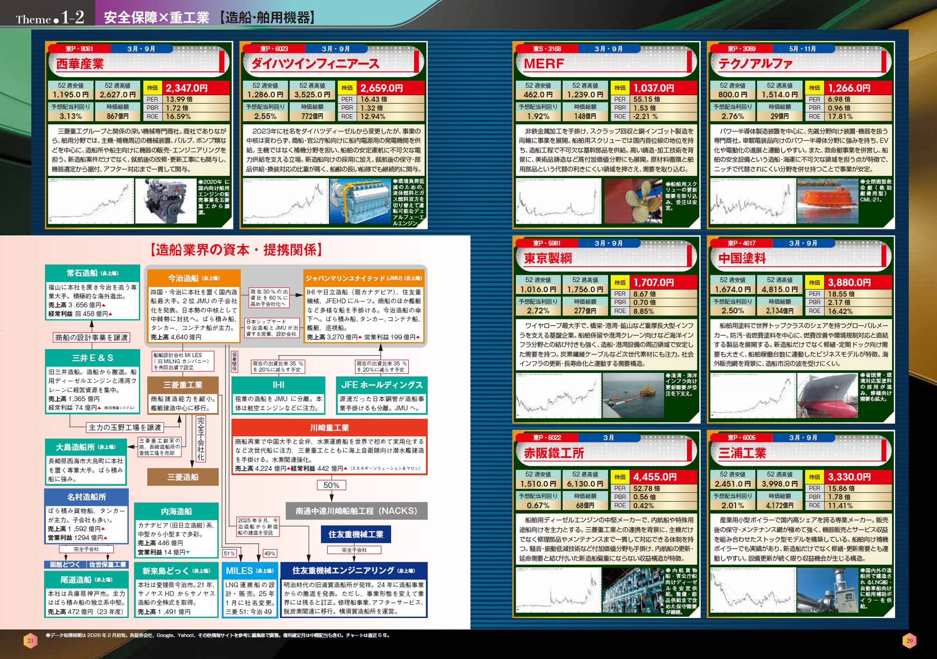 「第一章 安全保障×重工業」では、いまもっとも話題の防衛、航空宇宙、造船、港湾ロジスティクスというテーマと関連銘柄を追い、業界の現在をお伝えします。巨大重工の中には、すでにここ5年で株価が4~5倍になっているものもあります。また、わかりづらい造船業界の業界地図も盛り込みました。