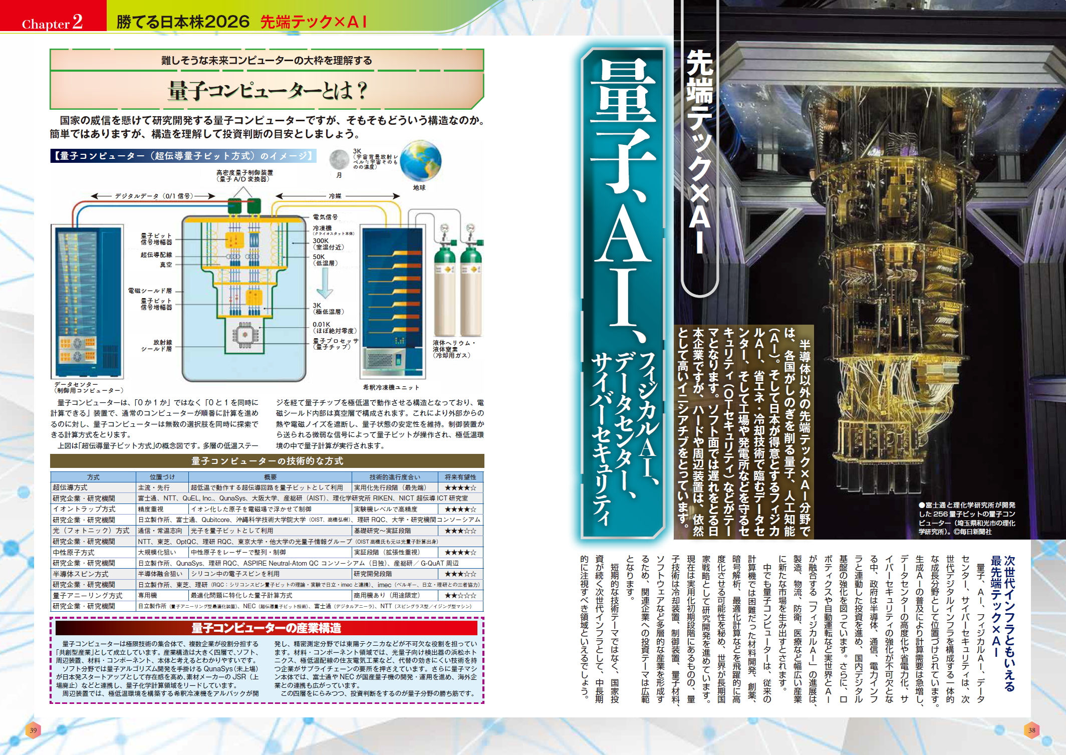 「第2章 先端テック×AI」では国策として期待が高まる半導体、量子コンピューター、AI、フィジカルAI、データセンター、サイバーセキュリティ関連銘柄を解説しています。半導体に関しては、わかりやすい図で製造工程を掲載。また、量子コンピューターの簡単な解説なども掲載し、先端技術の「わからない」を解決します。