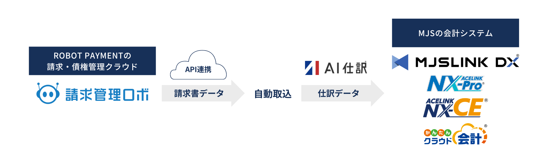 株式会社ROBOT PAYMENT(本社:東京都渋谷区、代表取締役:清久 健也、以下 当社)は、財務・会計システムおよび経営情報サービスを開発・販売する株式会社ミロク情報サービス(本社:東京都新宿区、代表取締役社長:是枝 周樹、以下「MJS」)の会計システム4製品、『MJSLINK DX(エムジェイエスリンク ディーエックス)財務大将』『ACELINK NX-Pro(エースリンク エヌエックスプロ)会計大将』『ACELINK NX-CE(エースリンク エヌエックス シーイー)会計』『かんたんクラウド会計』のオプション機能「AI仕訳」と、当社が提供する請求・債権管理クラウド『請求管理ロボ』とのAPI連携を開始しました。