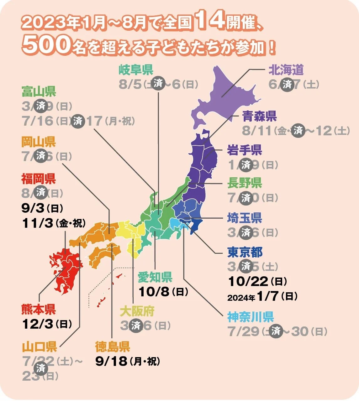 2023年度は、夏休み期間に、北は青森県から南は福岡県まで全国8箇所で開催され、300名を超える子どもたちが参加をしてくれました。9月以降も、福岡・徳島・愛知で開催予定です。