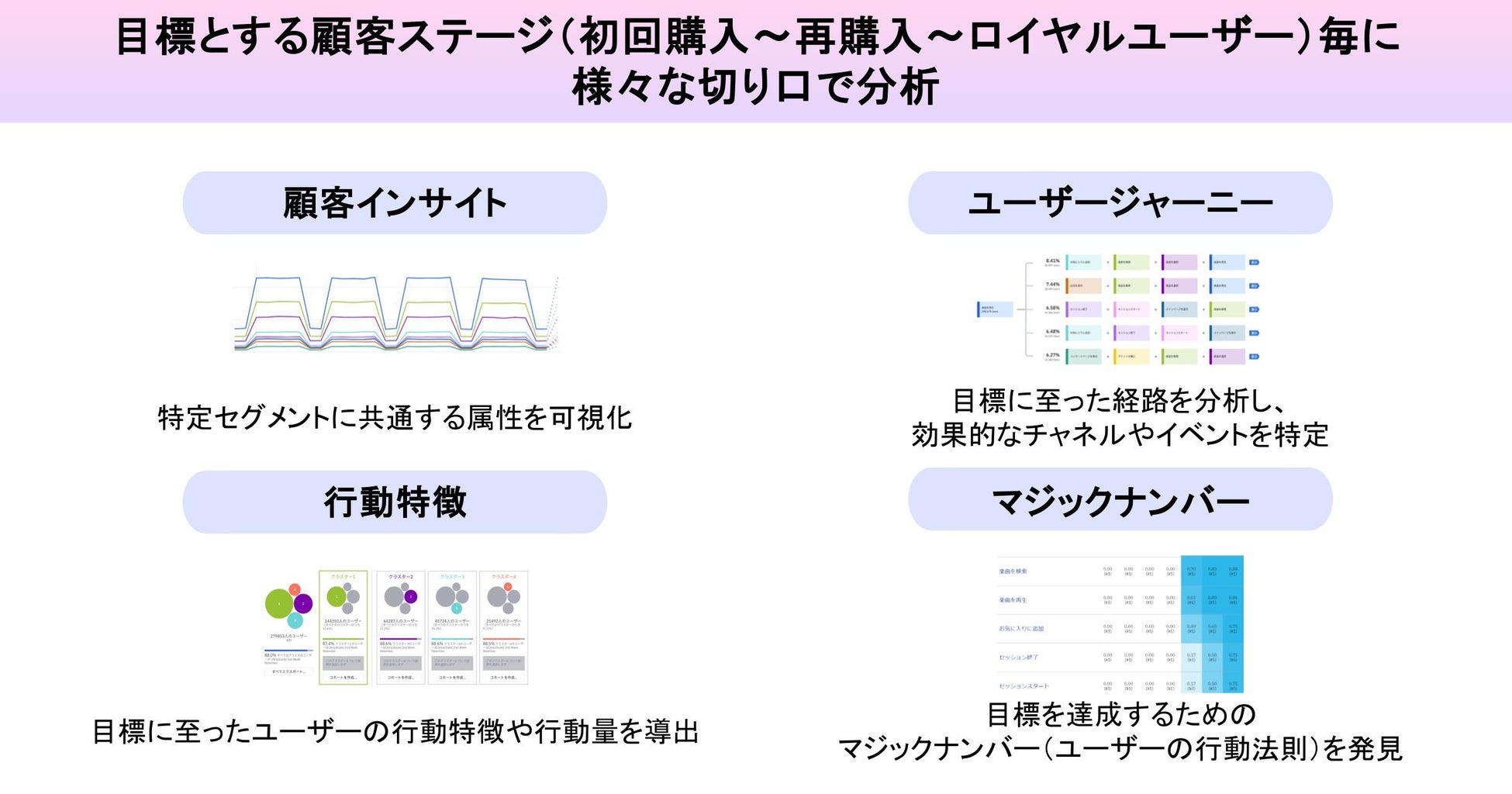 本サービスは、新規顧客の購買、2回目以降の購入、顧客のロイヤル化、休眠抑止など、ECビジネスでの主要KPIを高めるための先行指標を発見し、サービス改善施策に役立てる示唆を提供します。