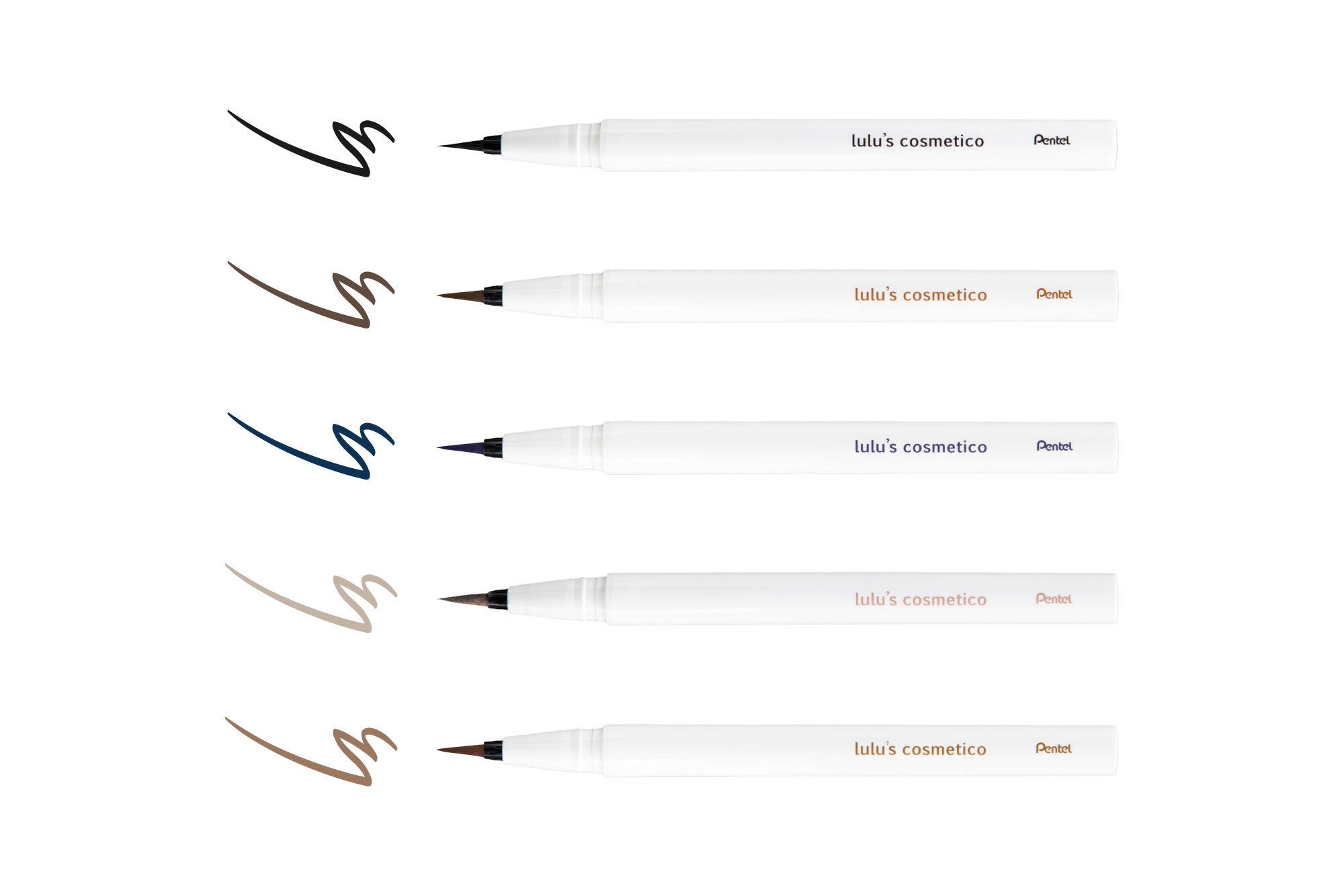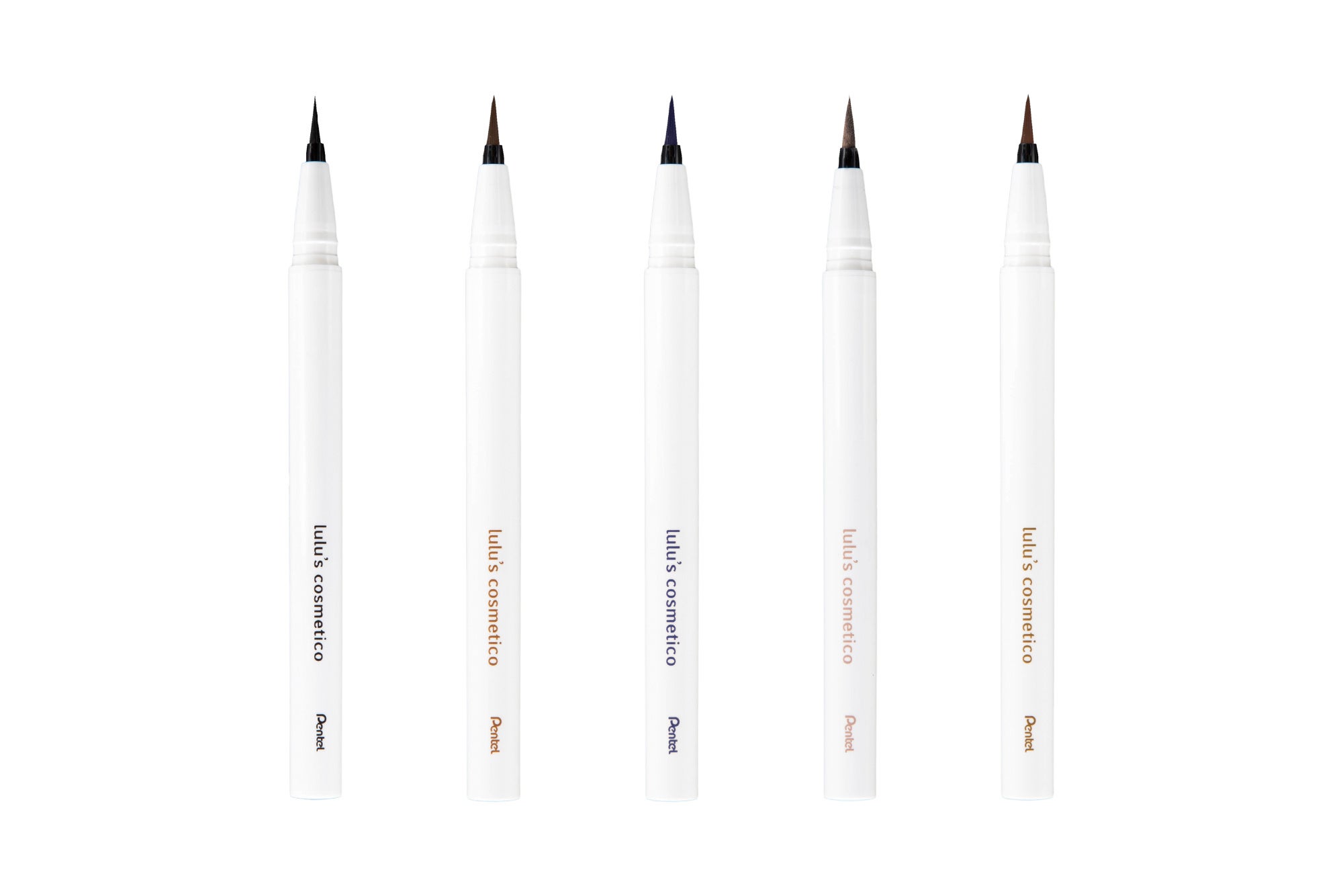 既存の「ブラック」「ダークブラウン」「プルシアンブルー」の3色のラインナップに、肌なじみの良い「グレーベージュ」と「ローシェンナ」の新色2色が加わり、ルルズコスメティコのリキッドアイライナーは全5色展開となります。毎日のメイクに取り入れやすいベーシックなカラーから目元を鮮やかに演出するカラーまで、高発色のラインナップで目元を自然に明るく引き立てます。