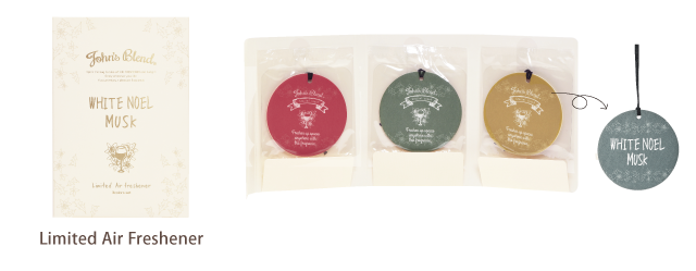 冬らしい3色のカラーリングのエアーフレッシュナーは、ツリーに飾るオーナメントをイメージしました。