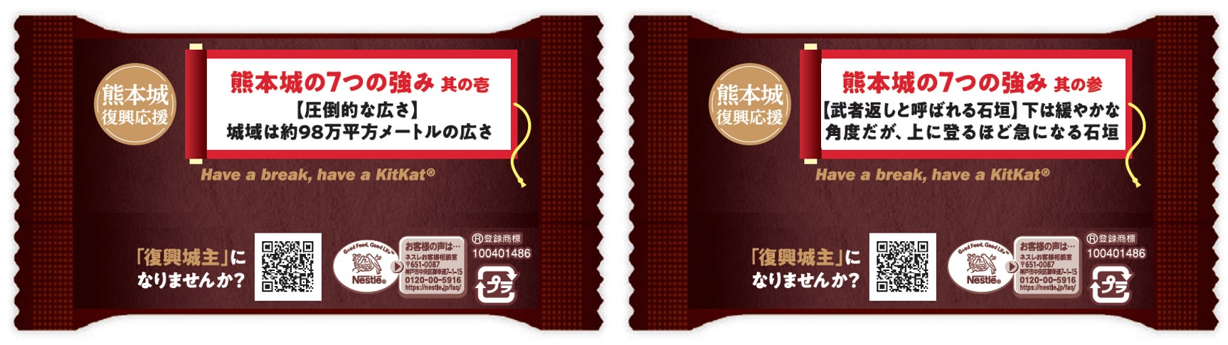 さらに、熊本地震の復興支援の一環として、熊本城の復旧・復元に向けた寄付制度である「復興城主」(※参考資料) を外箱にデザインし、個包装の裏面には熊本城の隠れた魅力を描いています。ネスレとフジバンビは、本製品の販売を通して、熊本城の復旧・復元を応援してまいります。