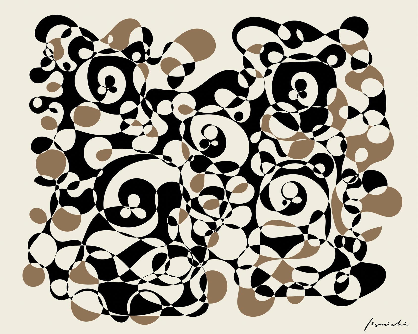 今回の展示は「森の造形」をテーマとし、静かで、時に荒々しい自然の美しさや強さ、様々な生命が纏う多種多様な造形を自身のフィルターを通しグラフィカルに表現。「森の動物(熊、鹿など)」や、「草木」をモチーフとした作品を中心に展示を行います。技法には氏が「Sen to Men」と表現する線と面による構成を起用。一本の「線」が紙の上を自由に動き回り、交差することで生まれる空間が「面」となります。小林氏はそこから生まれる新たな形を、生きとし生けるものが時空の中を彷徨い、紆余曲折を経てそれぞれの「絵(=痕跡)」を描くことと同一のものと捉え、作品へ息を吹き込みます。
