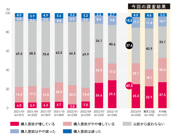 しかし、『1年前に比べて購入意欲が増しているか』については、47.3%が『購入意欲が増している』と回答しており、市況悪化を不安に感じる一方で、購入意欲は依然として高いままであることが分かりました。