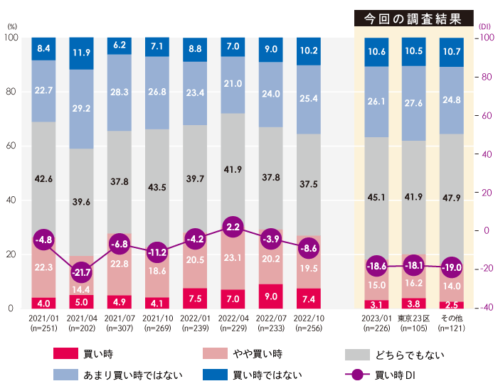 ※買い時DI(diffusion index)の算出は、(今マンションは「買い時」回答割合+「やや買い時」回答割合)-(今マンションは「あまり買い時ではない」回答割合+「買い時ではない」回答割合)で算出
