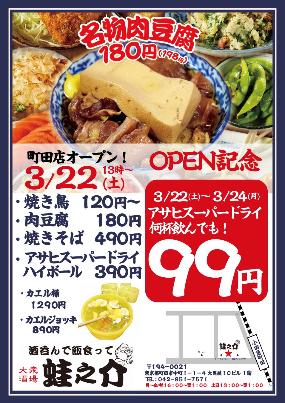 平日でも行列のできる居酒屋「大衆酒場 酒呑んで飯食って蛙之介」が町田上陸!オープンの3月22日(土)・23日(日)・24日(月)は生ビール99円!