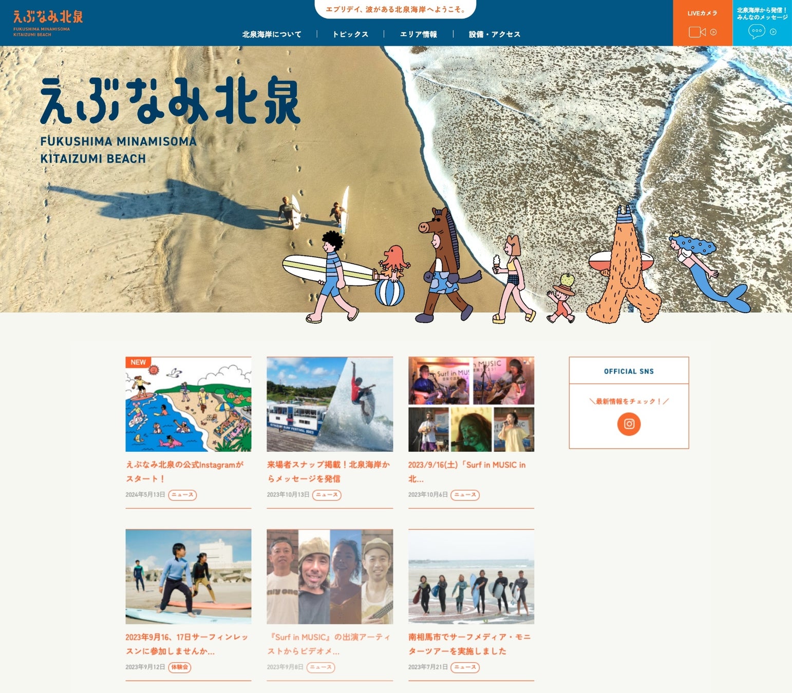 Webサイトのユーザー導線の見直しを図り、アップデートをしました。北泉海岸のすべての情報をわかりやすく、イベントなどがよりキャッチアップしやすいように、トピックスの記事コンテンツを拡充し、訪れていただいく際に必要となるエリア情報をはじめ、アクセスや設備・環境などを追加。「えぶな民」を登場させる動画コンテンツの拡充も予定しております。