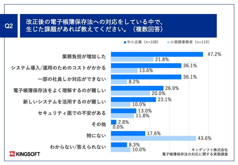 「Q2.改正後の電子帳簿保存法への対応をしている中で、生じた課題があれば教えてください。(複数回答)」と質問したところ、中小企業の経営者・役員(n=108)は「業務負担が増加した」が47.2%、「システム導入/運用のためのコストがかかる」が36.1%、「一部の社員しか対応ができない」が36.1%、小規模事業者(n=110)は「業務負担が増加した」が21.8%、「電子帳簿保存法をよく理解するのが難しい」が20.0%、「システム導入/運用のためのコストがかかる」が13.6%という回答となりました。
