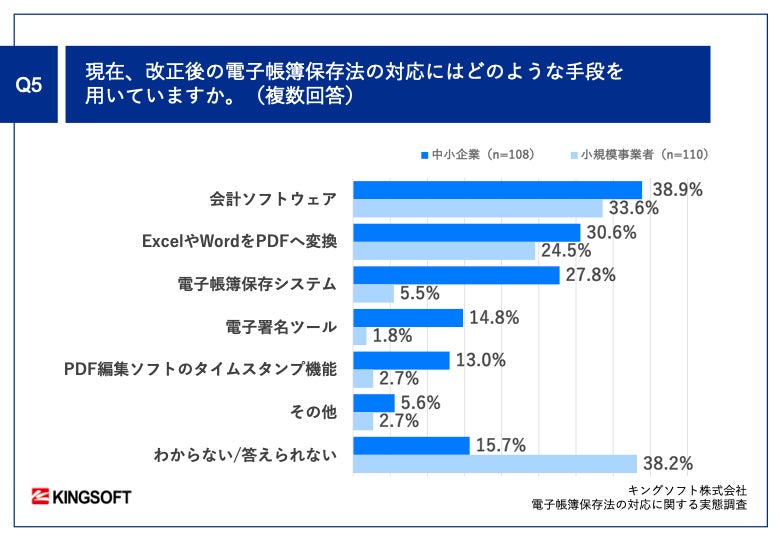 「Q5.現在、改正後の電子帳簿保存法の対応にはどのような手段を用いていますか。(複数回答)」と質問したところ、中小企業の経営者・役員(n=108)は「会計ソフトウェア」が38.9%、「ExcelやWordをPDFへ変換」が30.6%、「電子帳簿保存システム」が27.8%、小規模事業者(n=110)は「会計ソフトウェア」が33.6%、「ExcelやWordをPDFへ変換」が24.5%という回答となりました。