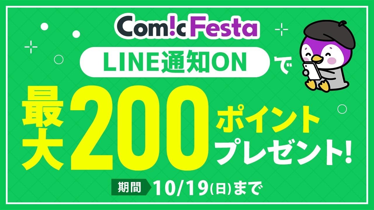 電子コミック配信サービスComicFestaにて、公式LINE通知をONにするだけで、最大200ポイントがもらえるキャンペーン開催!