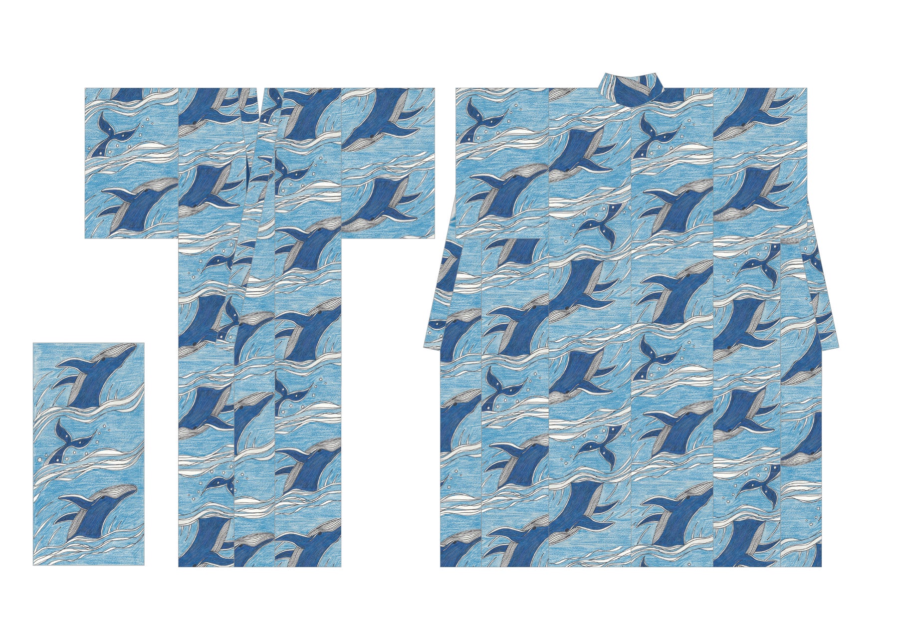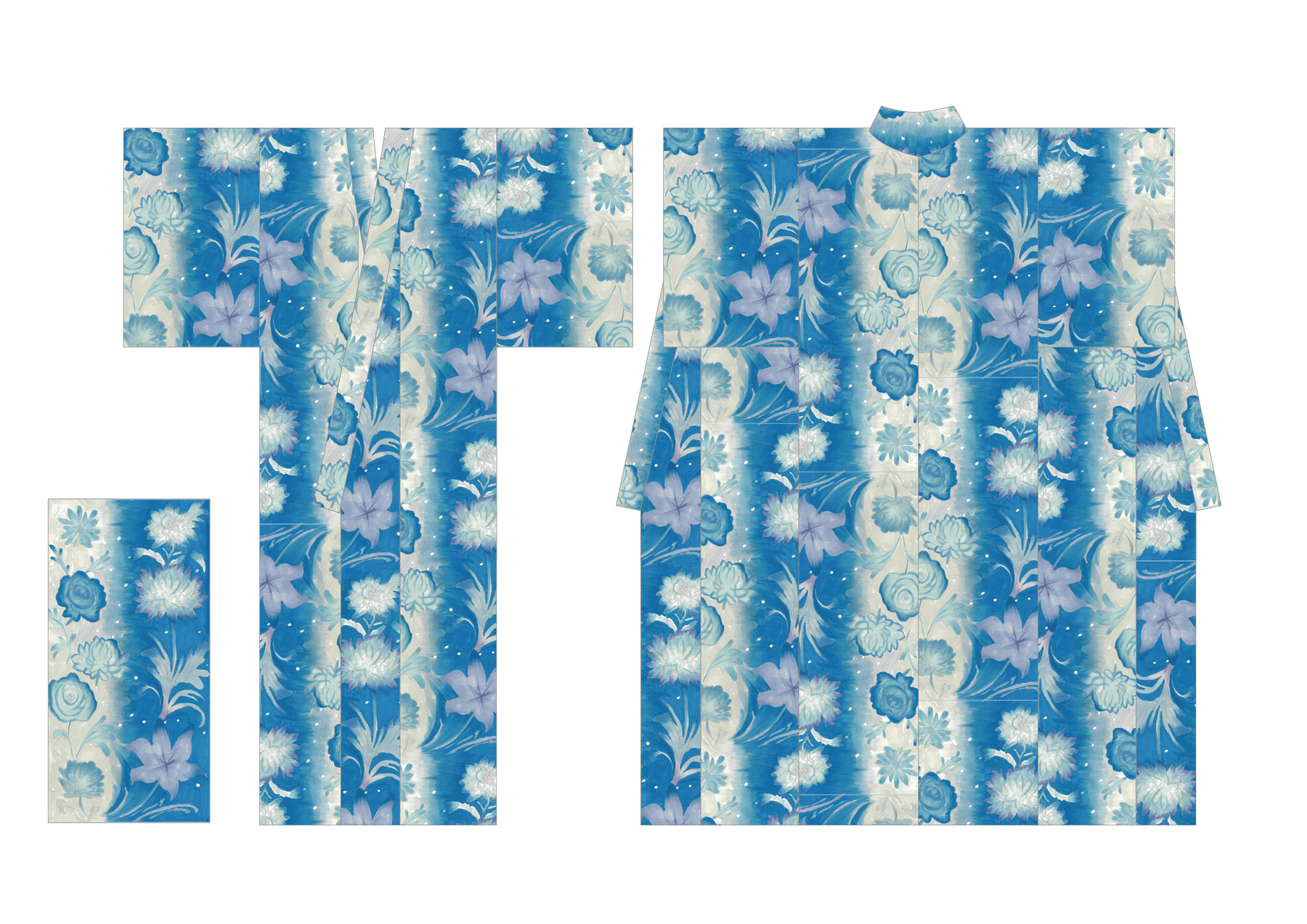作者の想い:「青い鳥」の童話を基に、幸せはすぐそばにあるというメッセージを込めました。白地に花火柄を配し、青をより引き立てています。