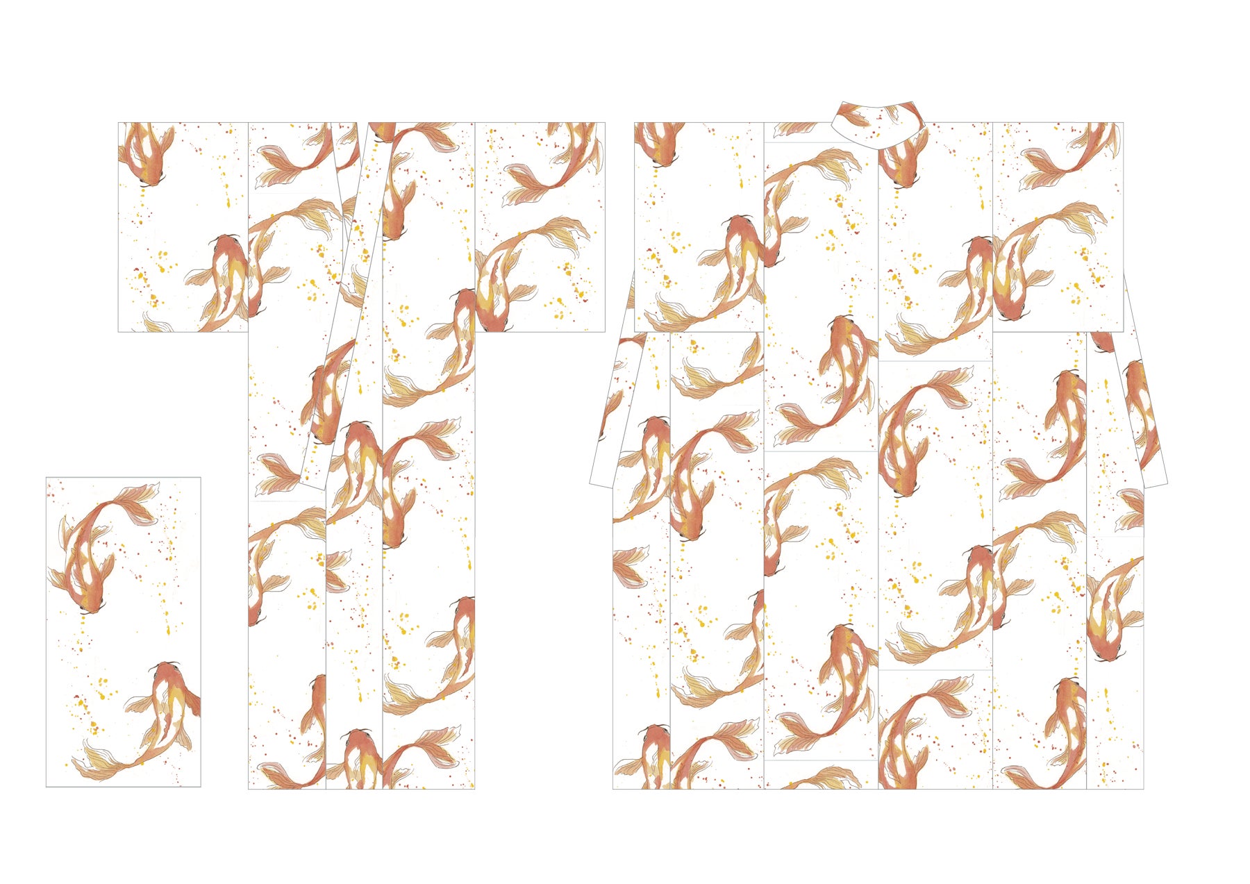 作者の想い:鯉の鮮やかな色と白地のコントラストで爽やかな印象に。スパッタリング技法で軽快さを表現しています。
