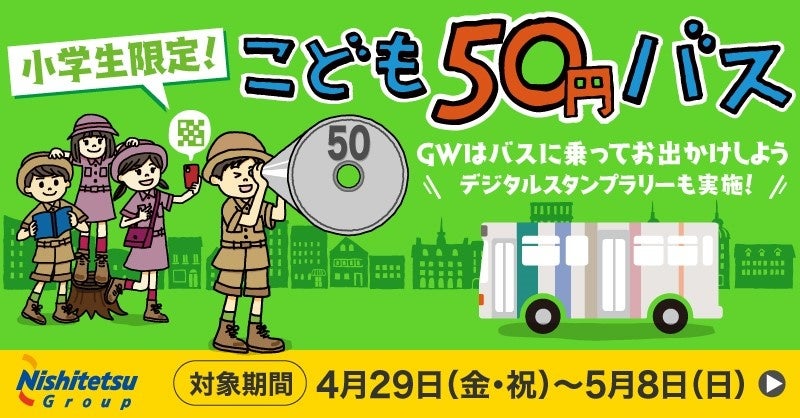 西鉄バスグループでは、4月29日(金・祝)から5月8日(日)までの10日間、小学生を対象としたバス運賃割引キャンペーン「こども50円バス」を実施いたします!