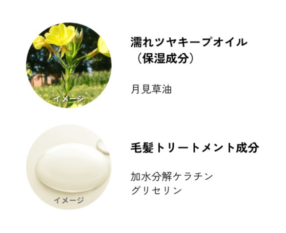 濡れツヤキープオイルとして、月見草油(保湿成分)を配合。また毛髪トリートメント成分として加水分解ケラチン、グリセリンを配合しています。