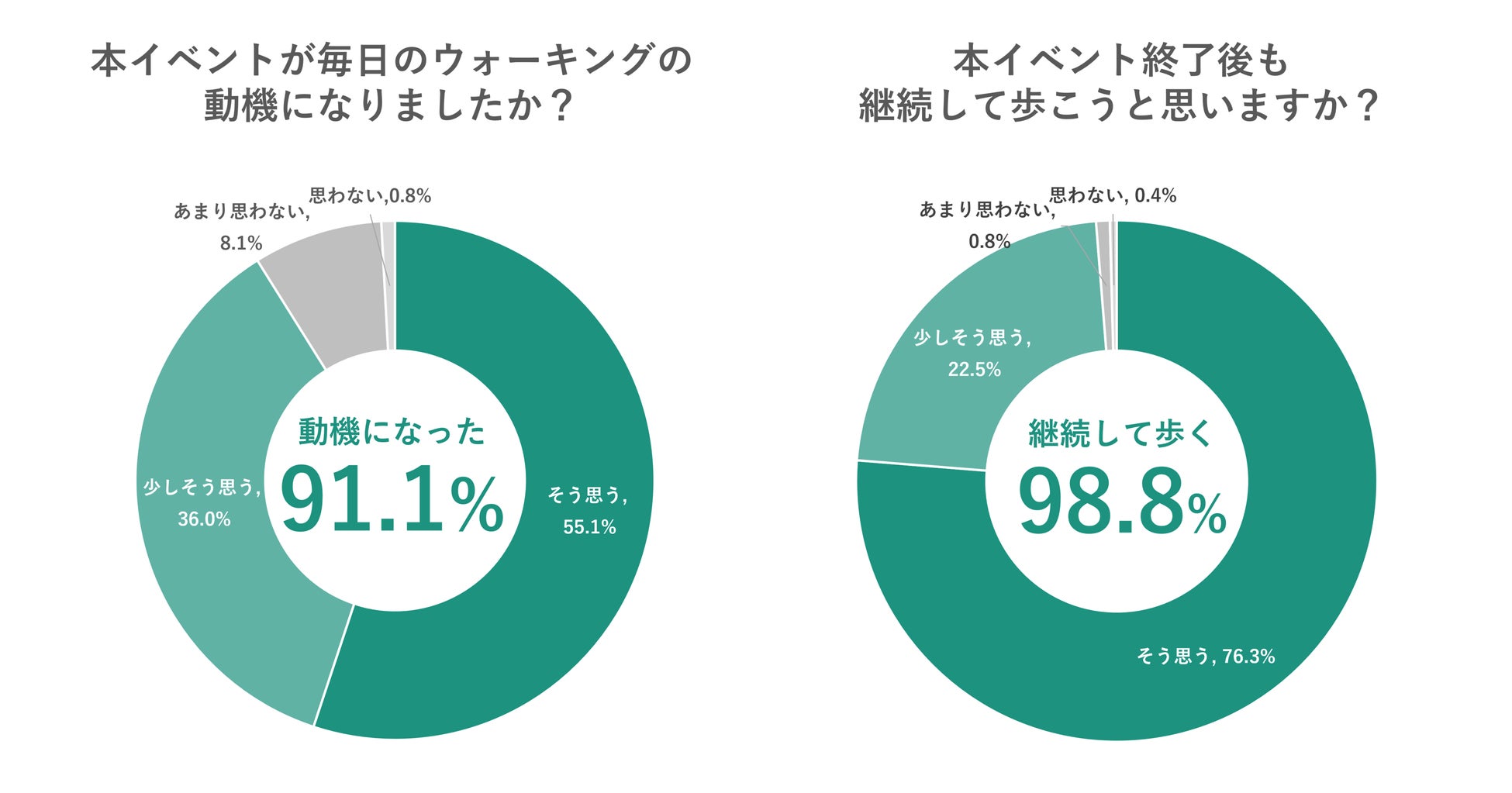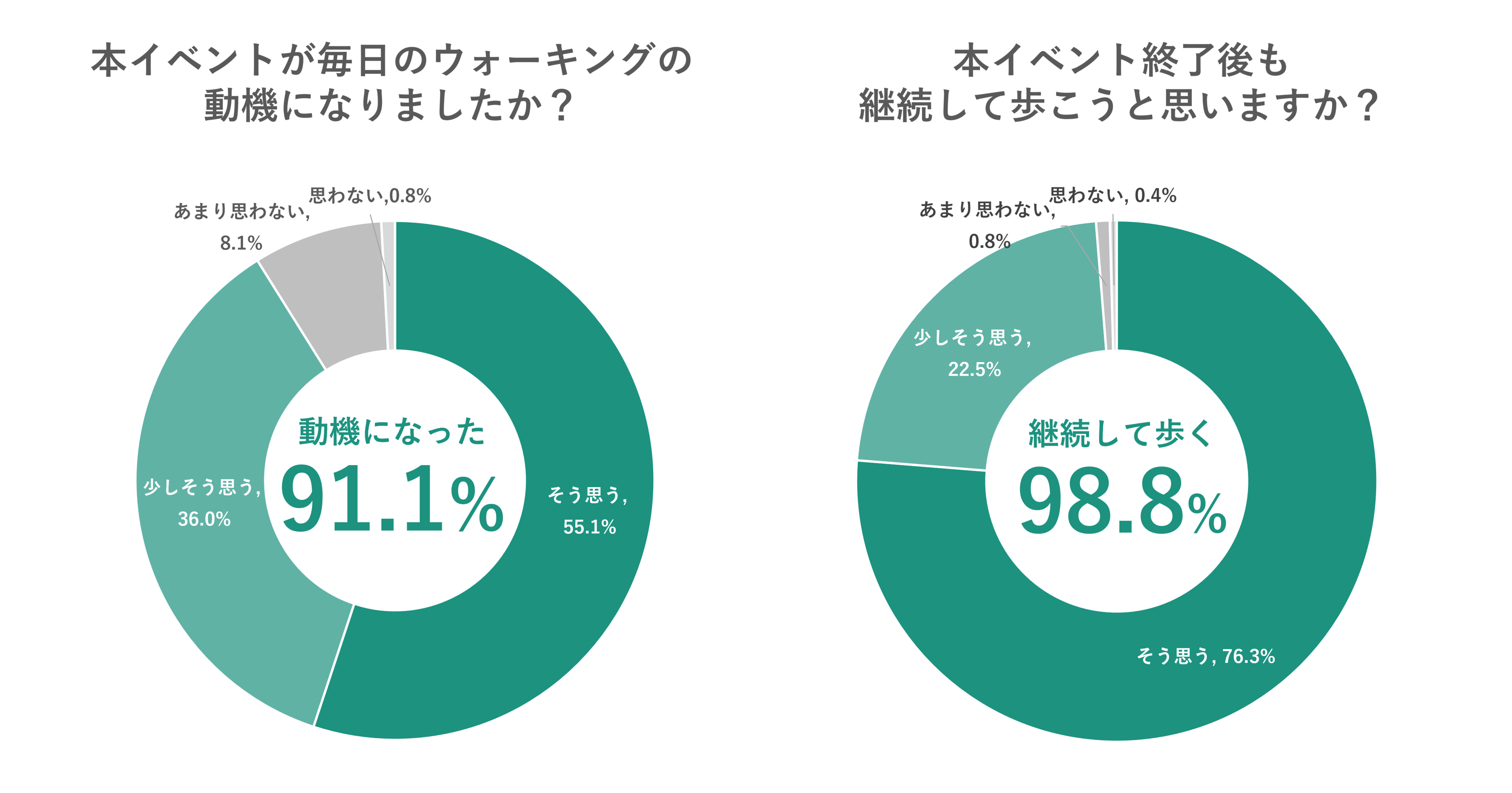 イベント後、参加者に対しアンケートを実施したところ、91.1%が「1day3000」が毎日のウォーキングの動機になったと回答し、98.8%がイベント後もウォーキングの継続意向があると回答しました。