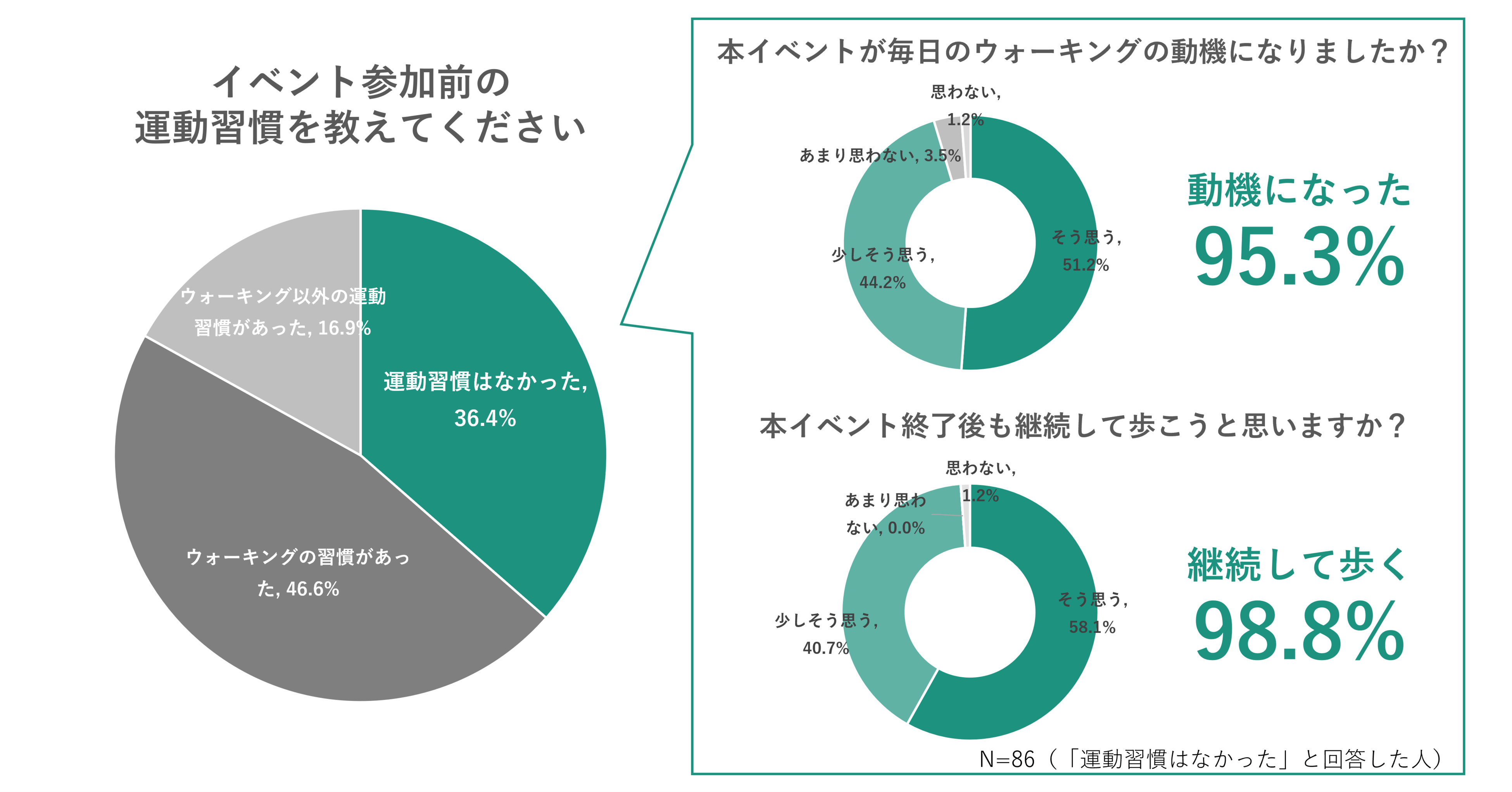 また、イベント参加前には運動習慣がなかったと回答した36.4%の人でも傾向は変わらず、95.3%が「1day3000」がウォーキングの動機になったと回答しました。イベント後のウォーキングの継続意向は98.8%を記録し、運動習慣の有無に関わらず、「1day3000」が参加者の健康意識にポジティブな影響を与えたことがわかりました。