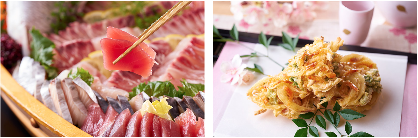 右:コの字型、全長24メートルのライブキッチンからご提供する揚げたての天ぷら。春らしく桜海老と地物のあおさを使った、香り高いかき揚げをお見逃しなく。