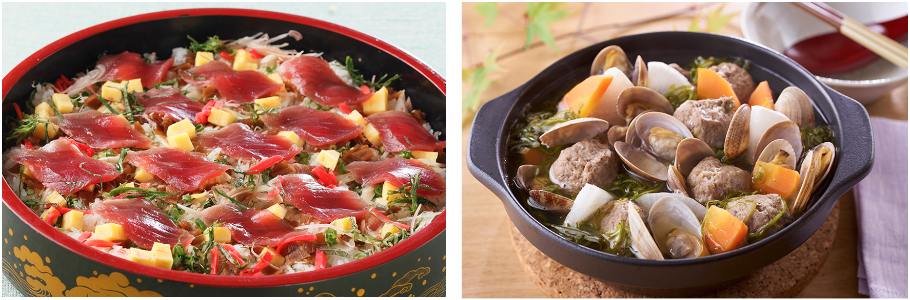 右:うまみたっぷりの出汁を使った鍋仕立てのメニューも伊勢志摩の自慢。この春はいわしのつみれとたっぷりの根菜を使った、肌寒い春先に嬉しい海鮮鍋をご用意しました。香りの良い鳥羽産のめかぶを添えて、その食感も一緒にお楽しみください。