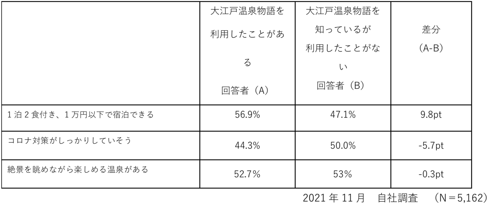 調査は「既に大江戸温泉物語を利用したことがある方(以下、利用者)」と「大江戸温泉物語を知ってはいるが利用したことはない方(以下、非利用者)」を対象に実施いたしました。宿泊料金、安全面を心配されている方も多いコロナ対策、基本価値である温泉の3つの項目で、利用者と非利用者のスコアに差がなく、双方の利用意向を同程度に喚起した項目は「絶景を眺めながら楽しめる温泉がある」でした。