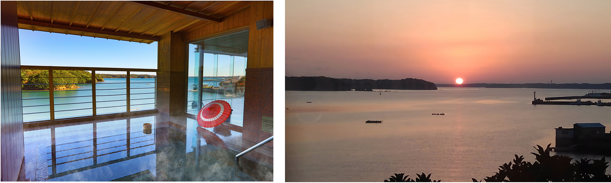 絶景露天風呂入浴のお薦めは朝。季節によっては水平線、橋杭岩の間から昇る朝日を眺めながら朝風呂をお楽しみいただけます。