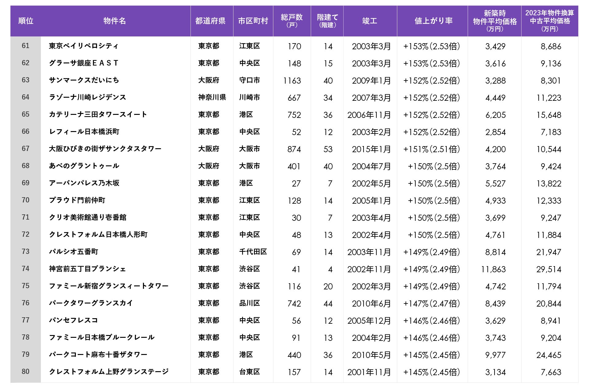 今回は、首都圏、関西、東海エリアで2023年(~12月末時点)に中古流通した住戸の中で各物件最も値上がりした住戸を元に中古マンションの値上がりランキングを作成しました。