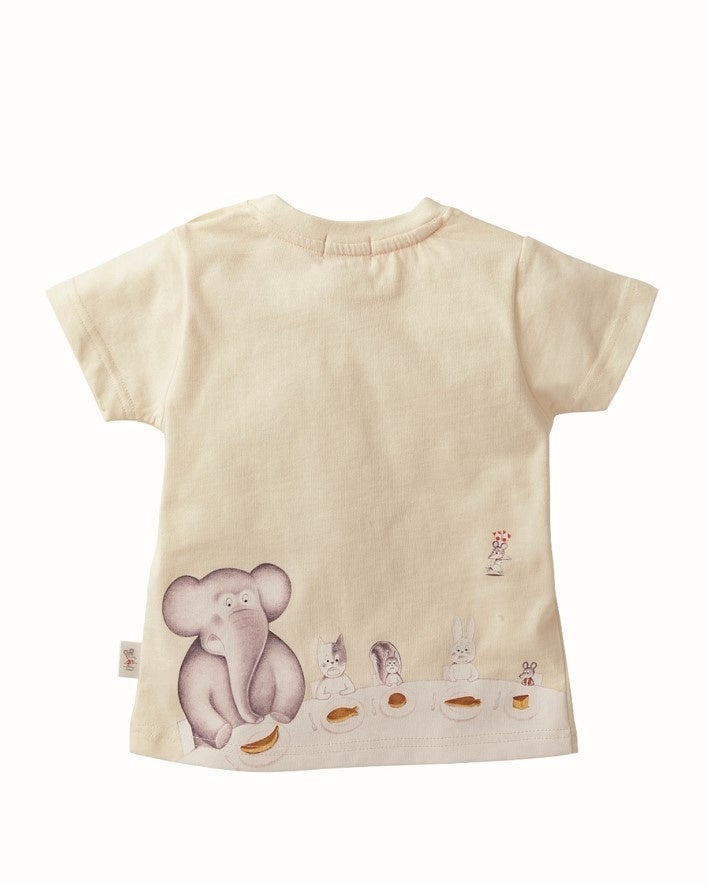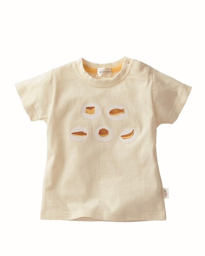 『ねずみくんとホットケーキ』がモチーフとなったTシャツは、ねみちゃんがみんなのために作ったホットケーキが描かれています。色んなかたちのホットケーキと、ねずみくんと動物たちの表情にも注目してみてください。