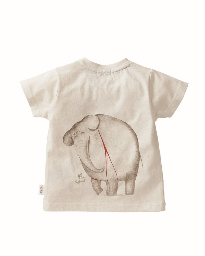 『ねずみくんのチョッキ』がモチーフとなったTシャツは、ねずみくんの小さなチョッキを着た大きな仲間と、のびてしまったチョッキを着るねずみくんが描かれています。