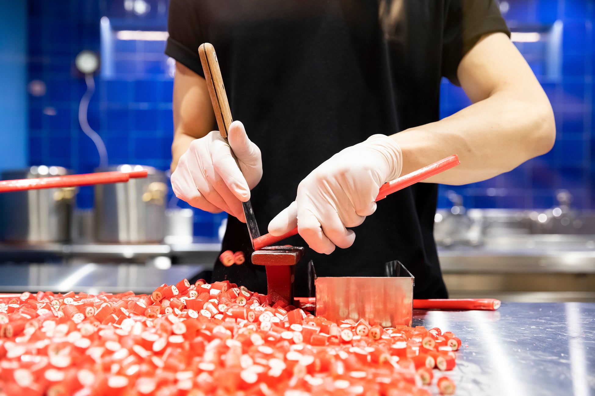 熟練職人の魔法で、ドロドロのキャンディの塊が様々な絵柄の入った直径1cmのキャンディに変身していく様子は老若男女問わず楽しめるエンターテインメントです。