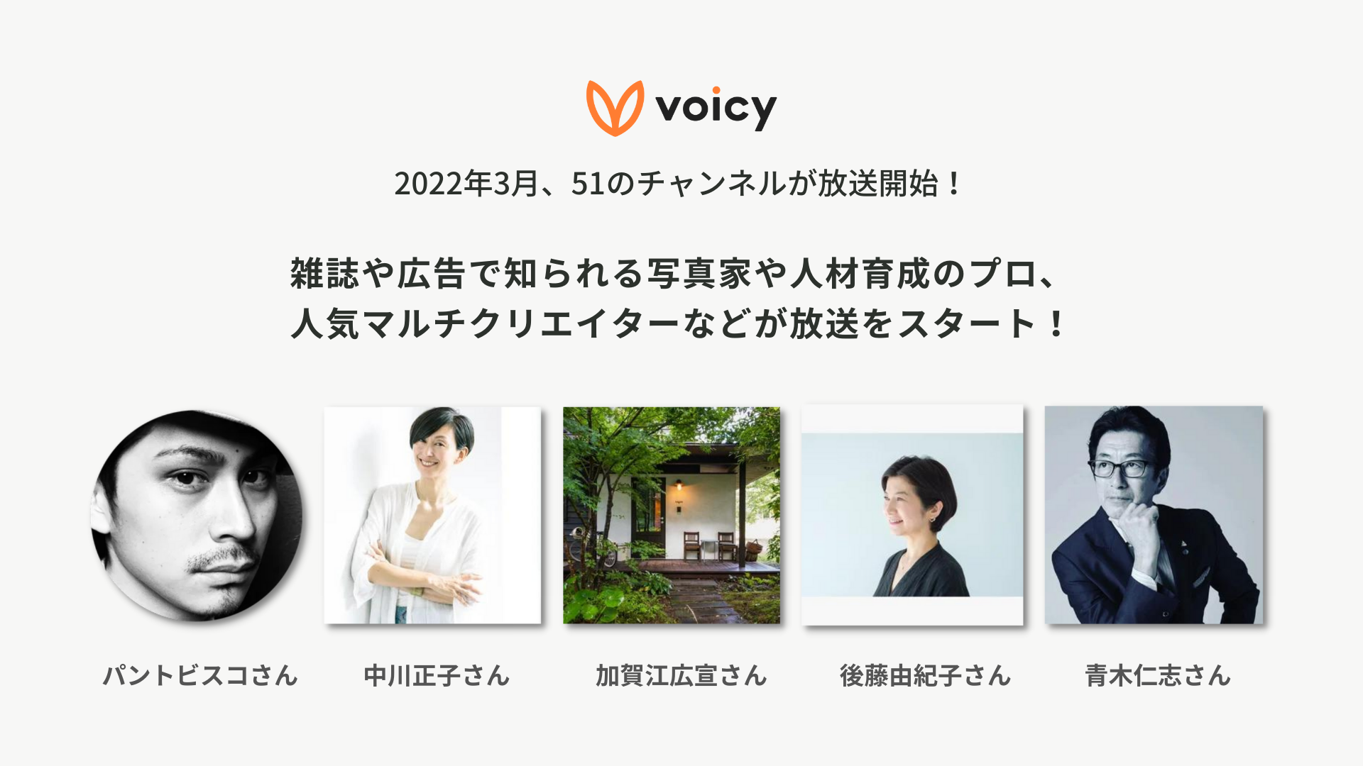2022年3月は51のチャンネルが開設!Voicyで音声放送開始したのは、雑誌や広告で知られる写真家や人材育成のプロ、人気マルチクリエイター。