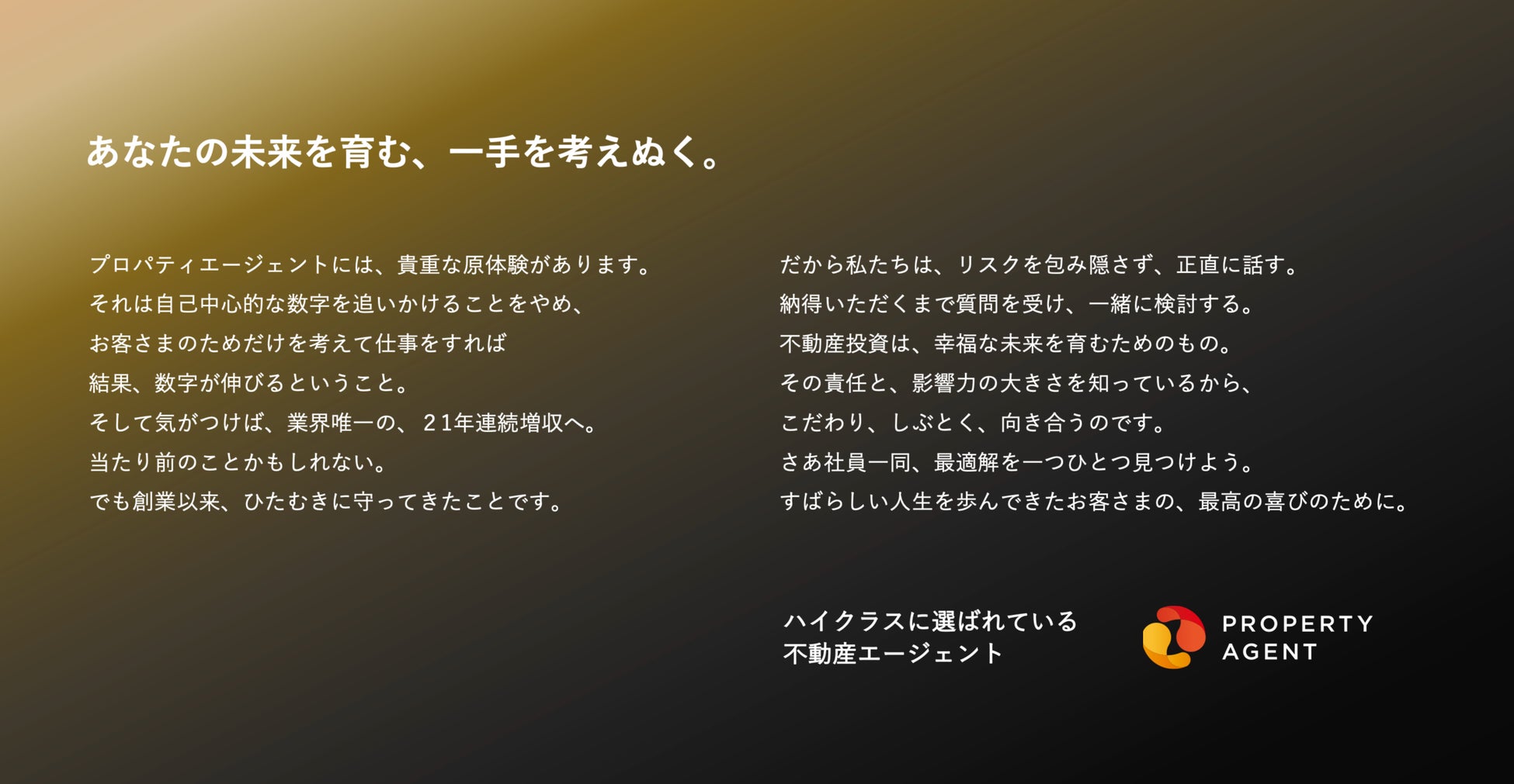 ハイクラスの方々に多く選んで頂いている事実と、その理由こそが、我々PAの強みであると結論づけるとともに、中期目標の達成に不可欠かつ強化すべき“PAらしさ”と位置付け、「ハイクラスに選ばれている不動産エージェント」というタグラインと以下ステートメントを策定しました。