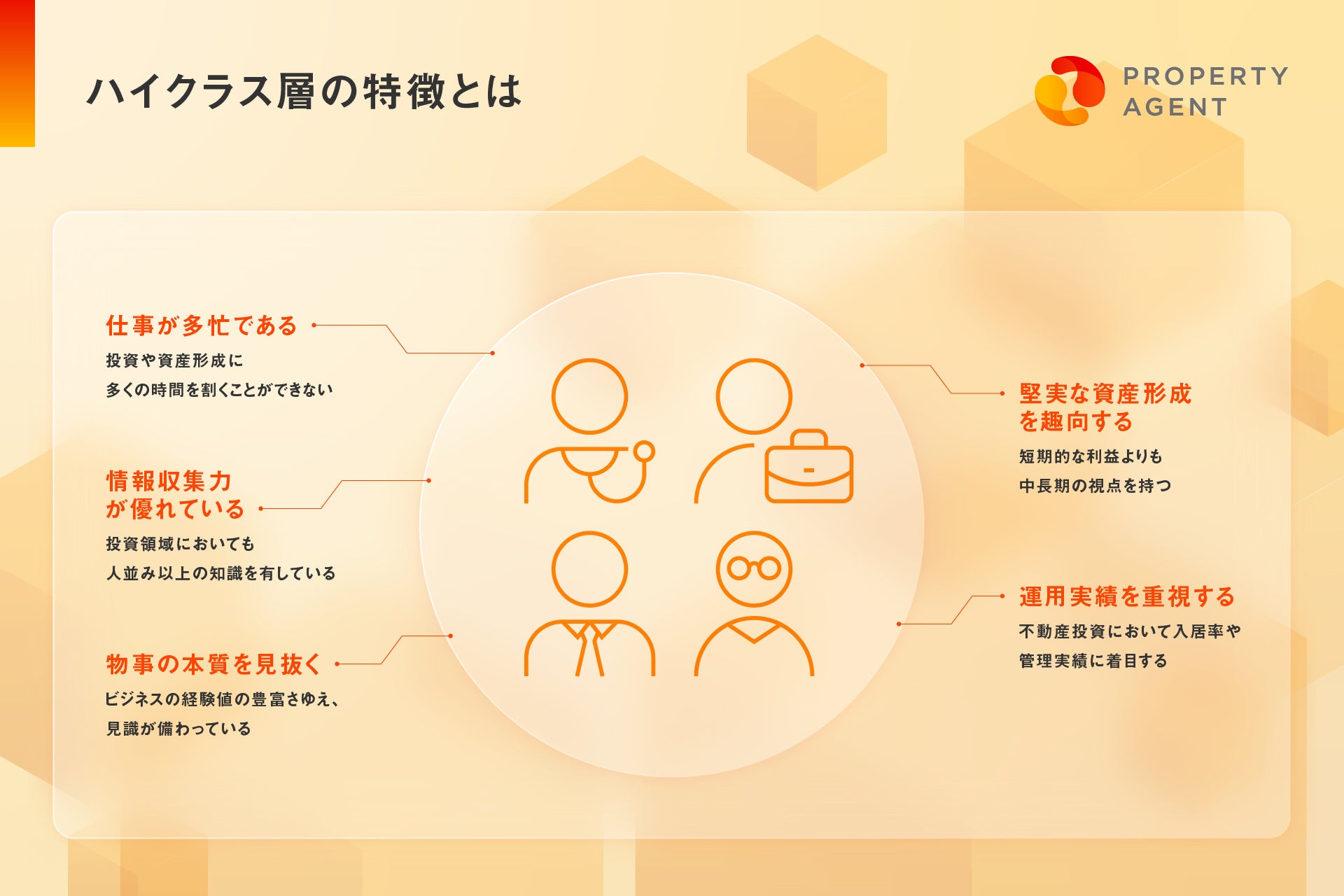 難しい経済状況下でも我々を信じ、大切な資産を託してくださるお客さまこそが、PAの持続的成長を支える原動力です。そんなPAのお客さまを見渡すと、投資用不動産業界のなかでも、とある属性の方々が多いことがわかりました。それは「ハイクラス」と呼ばれるビジネスパーソンの方々です。