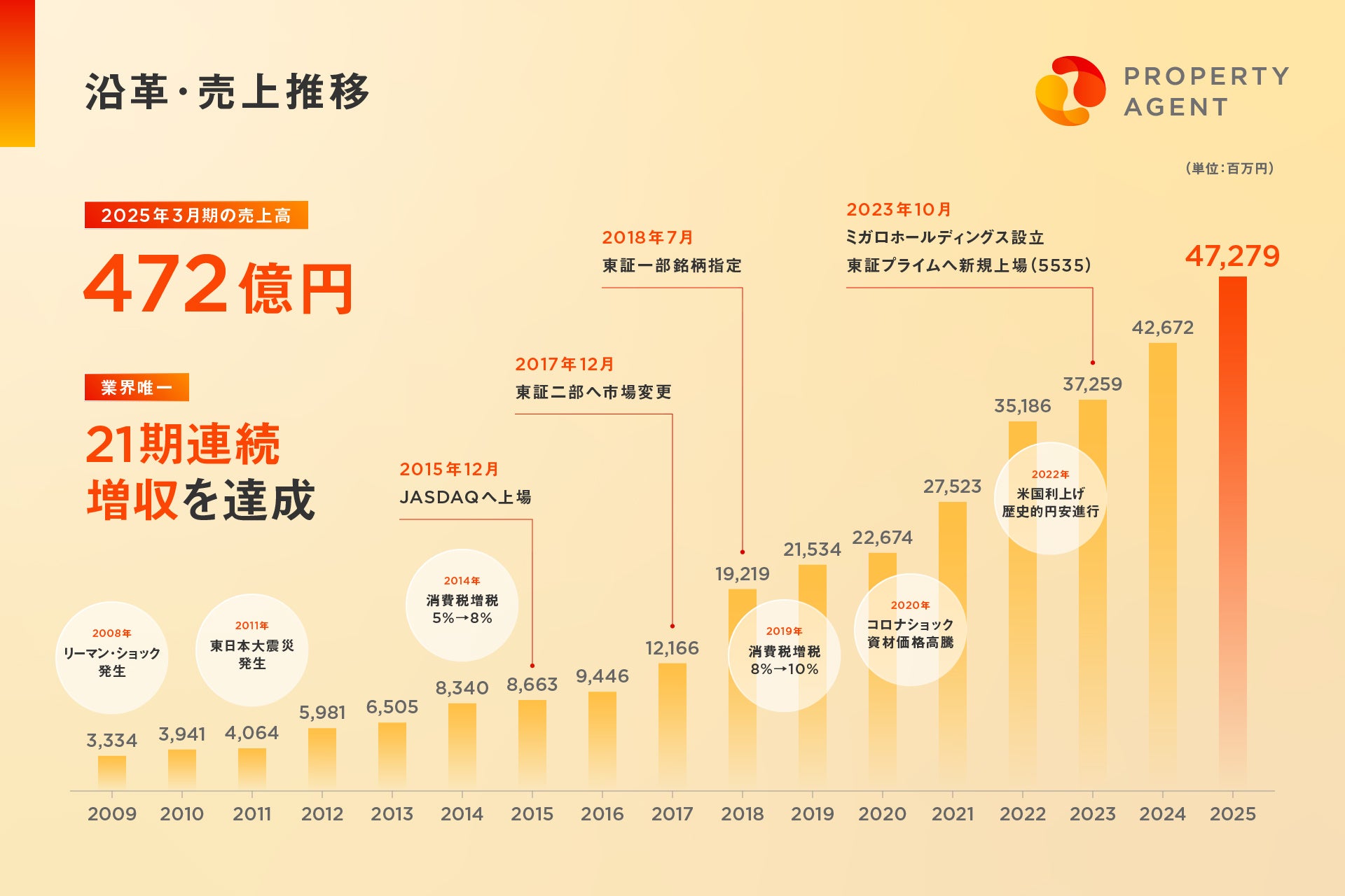 2004年の創業以来、21期連続での増収を達成することができました。リーマンショックや東日本大震災、コロナウィルスの影響を最小限に抑え、ビジネスを継続して成長させることができたのは、私たちPAを選んでくださるお客さまがいたからに他なりません。