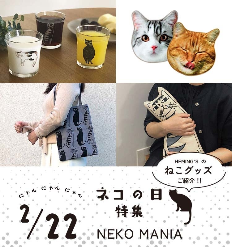 2月22日は【にゃん・にゃん・にゃん】のねこの日。ヘミングス(東京都渋谷区/代表取締役:水野裕之)では、毎年2月のねこの日に合わせて、様々なねこグッズを展開しています。おうちでも、お出かけでも、インテリアグッズもバッグやポーチも。