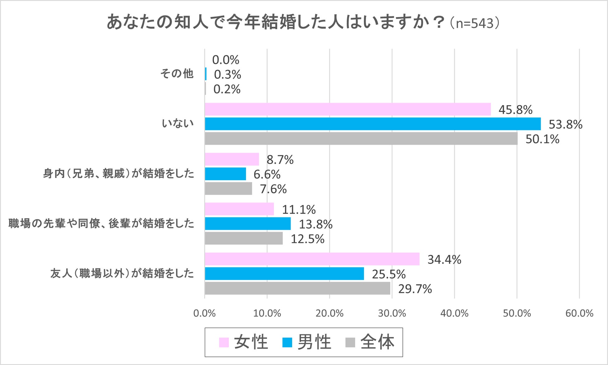 調査対象が25歳~34歳ということで、結婚をする割合が高い年齢層であることから、調査対象の約5割から「知人が今年結婚をした」という内容はうなずける結果であるといえます。