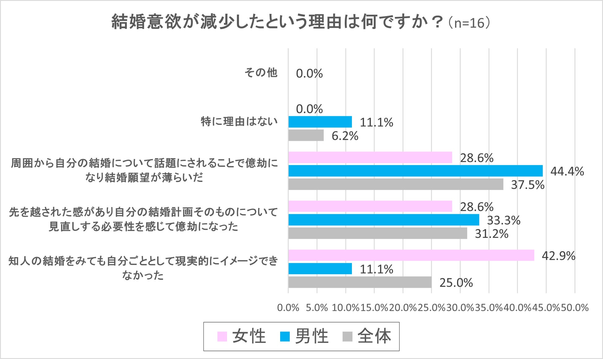 最後の設問では少数回答ではありますが、「知人が結婚したことで結婚意欲が減少した」という16人にその理由について伺ってみました。
