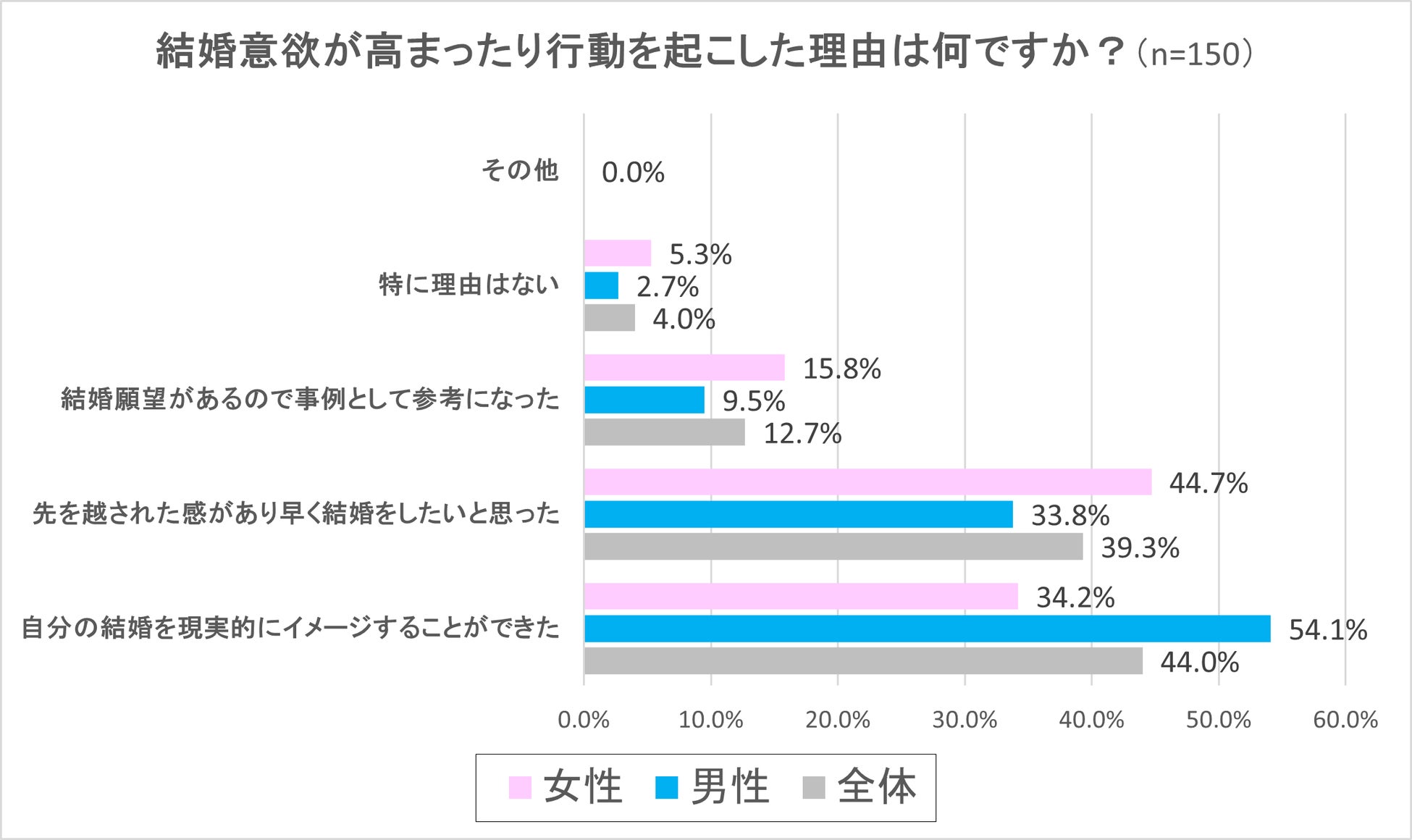 次の設問では、「結婚意欲が高まった」「行動を起こした」と回答した150人にその理由は何ですか?と伺ってみました。